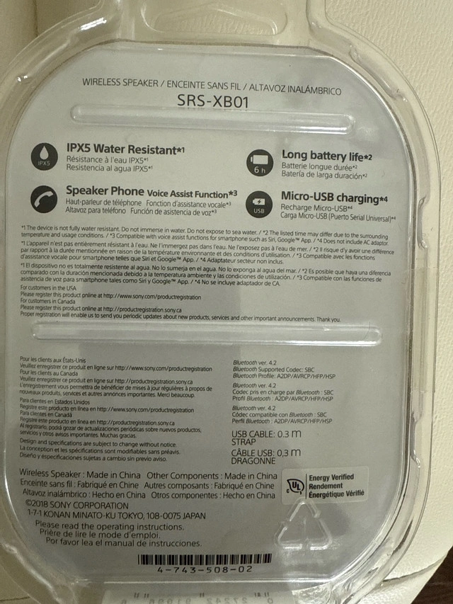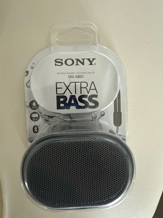 20Listen to your favourite music anywhere with this new Sony SRS-XB01 portable wireless speaker featuring EXTRA BASS for deep and punchy sound, IPX5 water-resistant design for worry-free use, and up to 6 hours of battery life. This compact speaker delivers impressive audio performance in a small package. Specifications: * EXTRA BASS * IPX5 Water Resistant * 6H Battery * Micro USB Charging. Feel free to message if you have any questions!