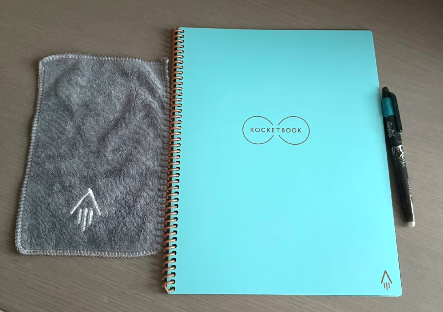 Reusable smart notebook (8.5” × 11”, dot grid pages) in good condition. A few faint marks on the first couple pages from prior use, but fully cleanable and works perfectly. Includes one Pilot FriXion pen and one Rocketbook microfiber cloth.