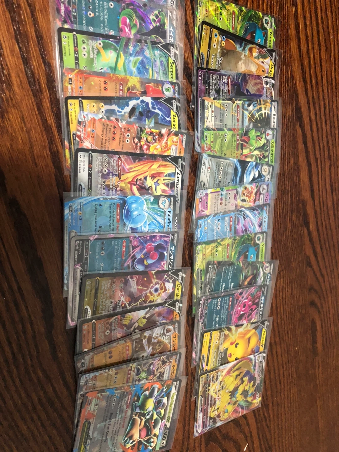 Selling a collection of Pokémon cards, including various V and VMAX cards. All cards are in sleeves for protection. Great for collectors or players!