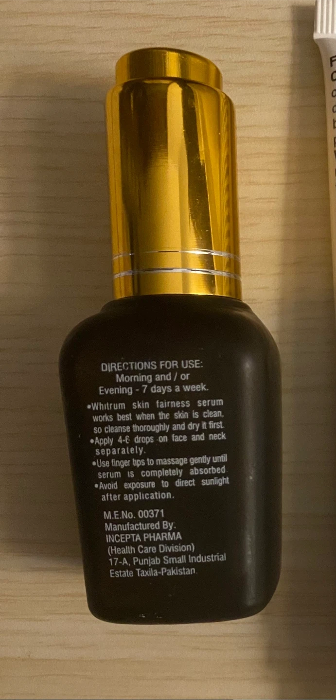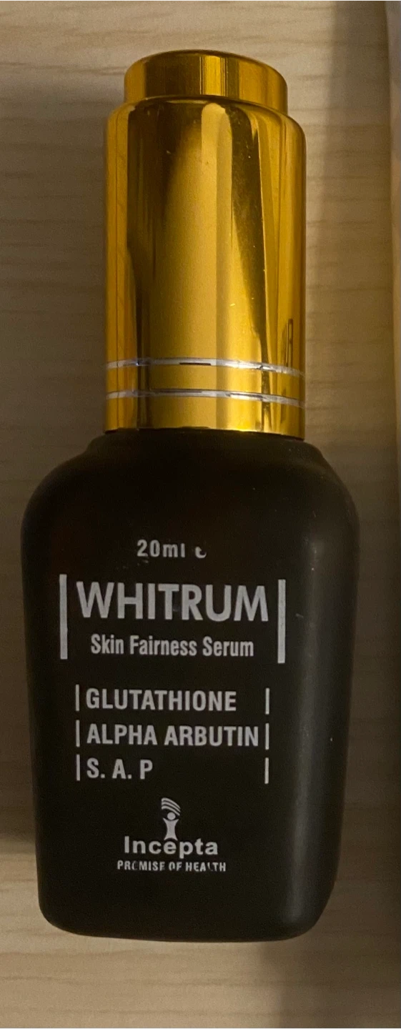 I'm selling Whitrum Skin Fairness Serum. It contains Glutathione, Alpha Arbutin, and S.A.P. For directions, use in the morning and/or evening, 7 days a week. Cleanse the skin thoroughly and dry it first, then apply 4-5 drops on the face and neck separately. Use your fingertips to massage gently until the serum is completely absorbed. Avoid exposure to direct sunlight after application