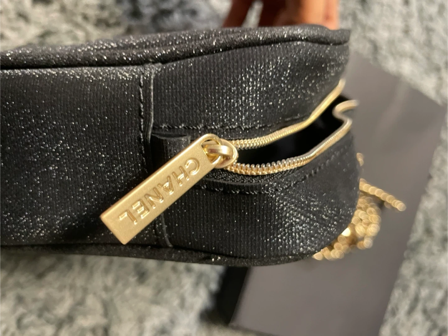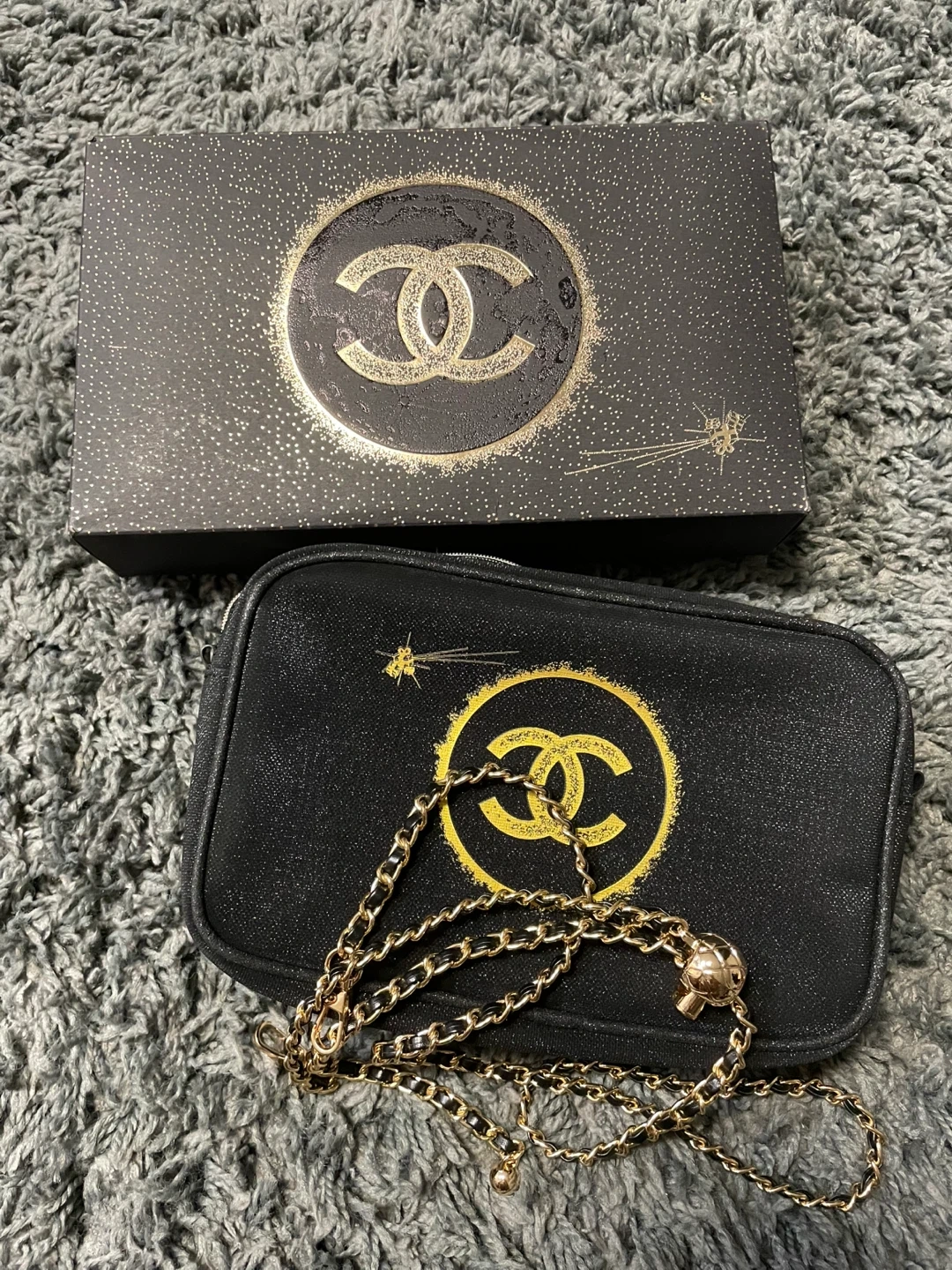 15Selling a stylish Chanel black cosmetic pouch, complete with a chic chain. The pouch comes with its original box. Perfect for adding a touch of luxury to your everyday essentials!