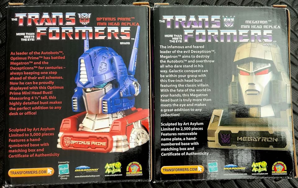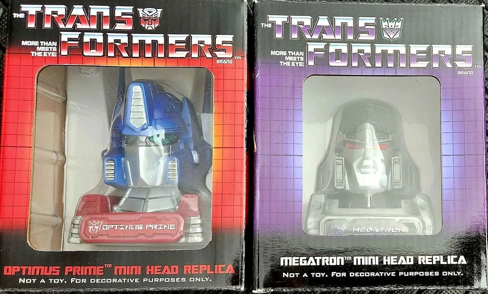 Transformers collectors! Add the ultimate Autobot leader and Decepticon tyrant to your collection. This is a set of two officially licensed mini head replicas featuring the classic Generation 1 designs of Optimus Prime and Megatron. Both are limited, numbered editions—a must-have for any serious collector. In original packaging and never opened.