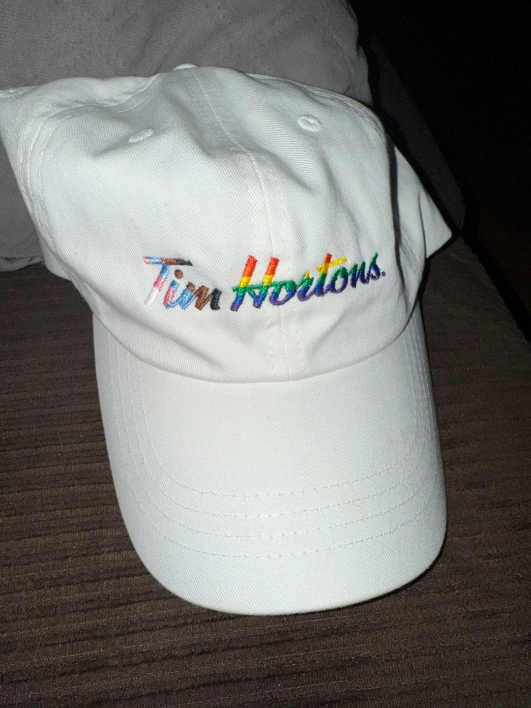 Here's a Tim Hortons baseball pride cap in white! It's in great condition and has the Tim Hortons logo embroidered in rainbow colours. A fun and stylish way to show your love for Tims!