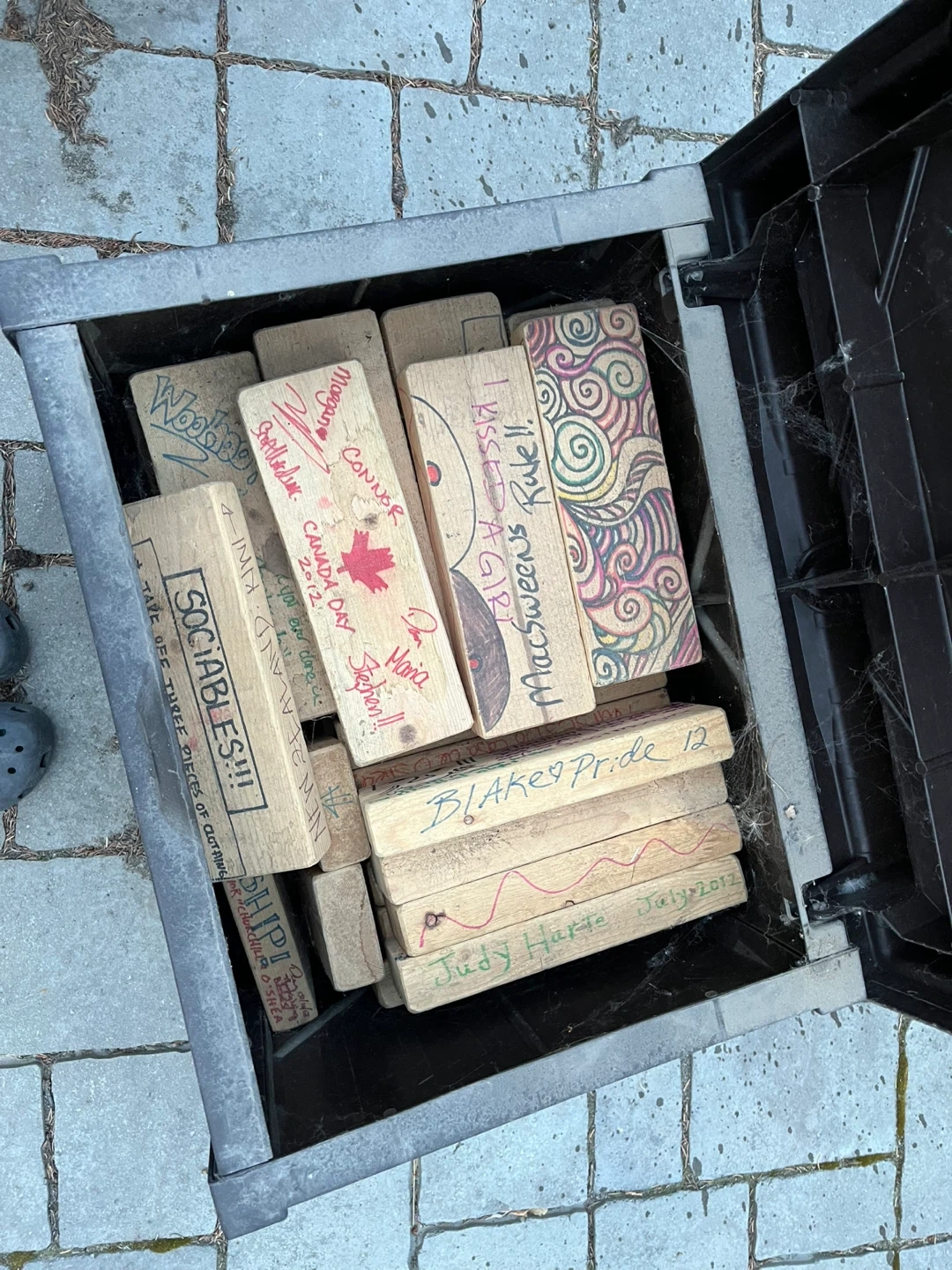 44FREE Giant jenga game. Warning the blocks are covered in profanity you may want to paint them :) Bin not included please bring something to carry them in.