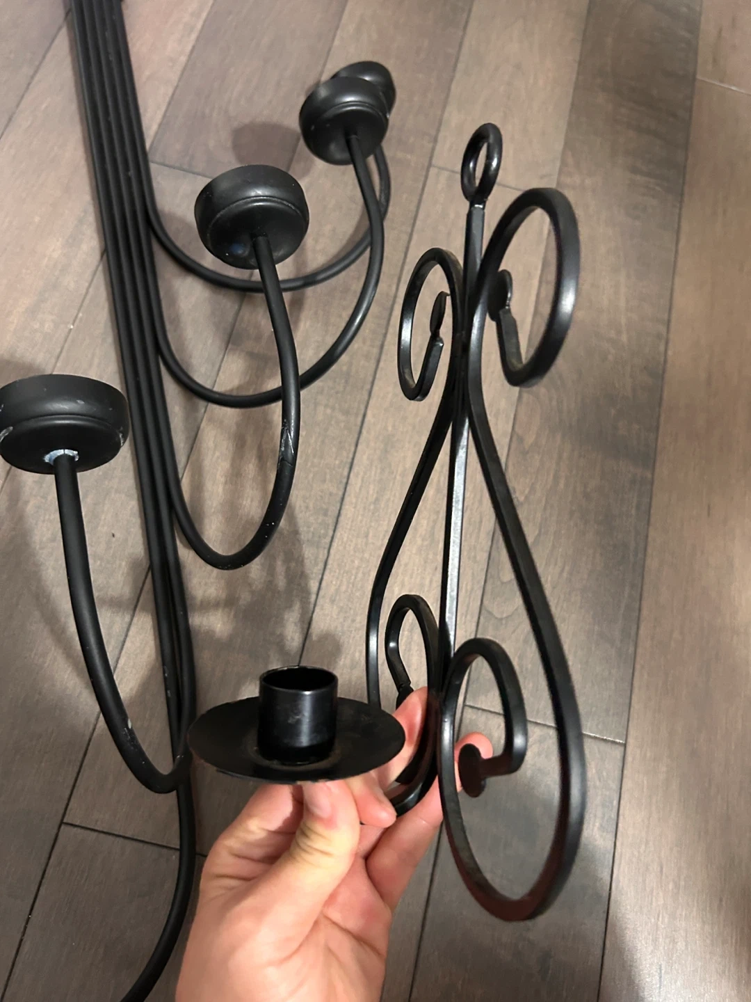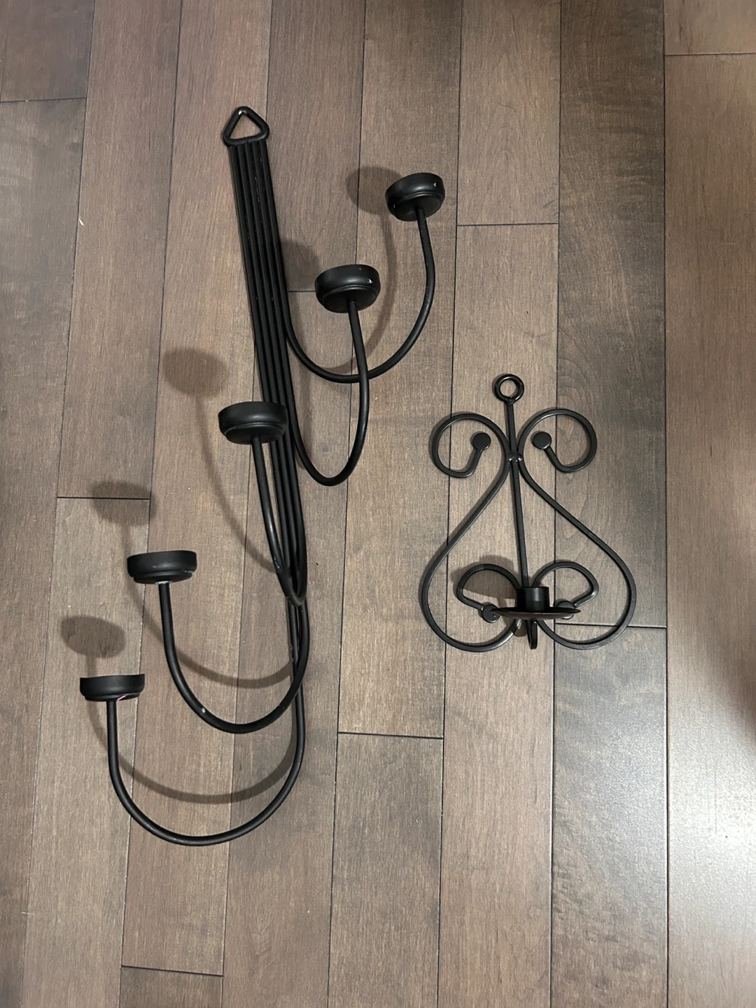 Selling a set of two black metal candle holders. One is a multi-candle wall sconce, and the other is a smaller, decorative candle holder. They're perfect for adding a touch of elegance to any room!