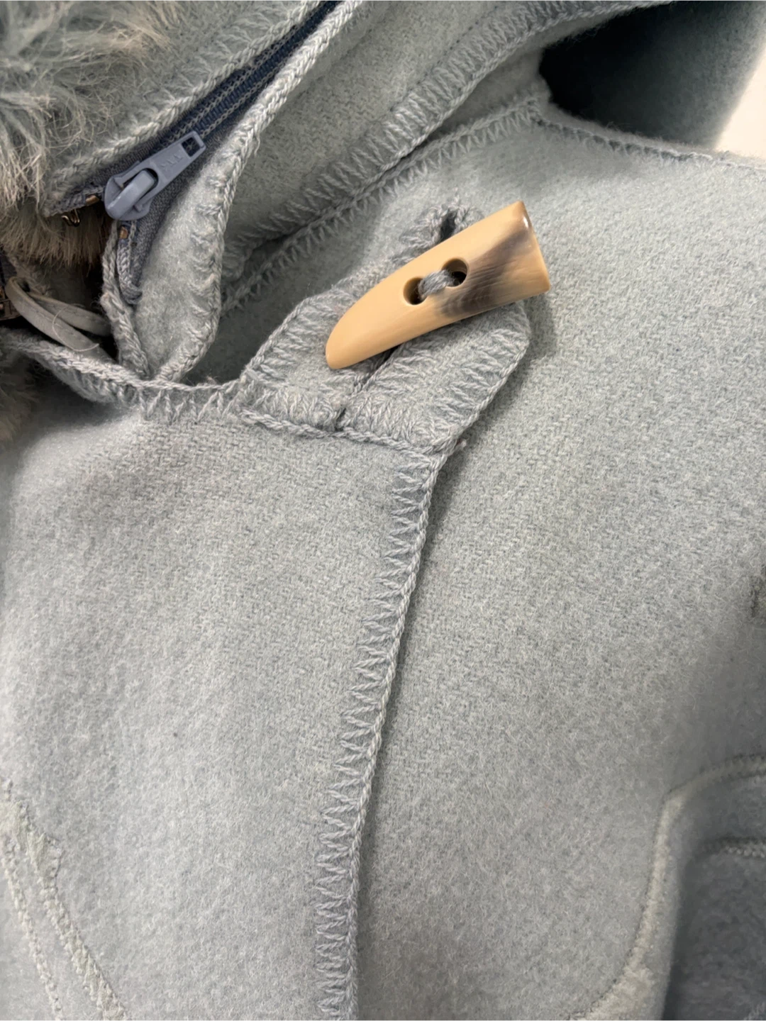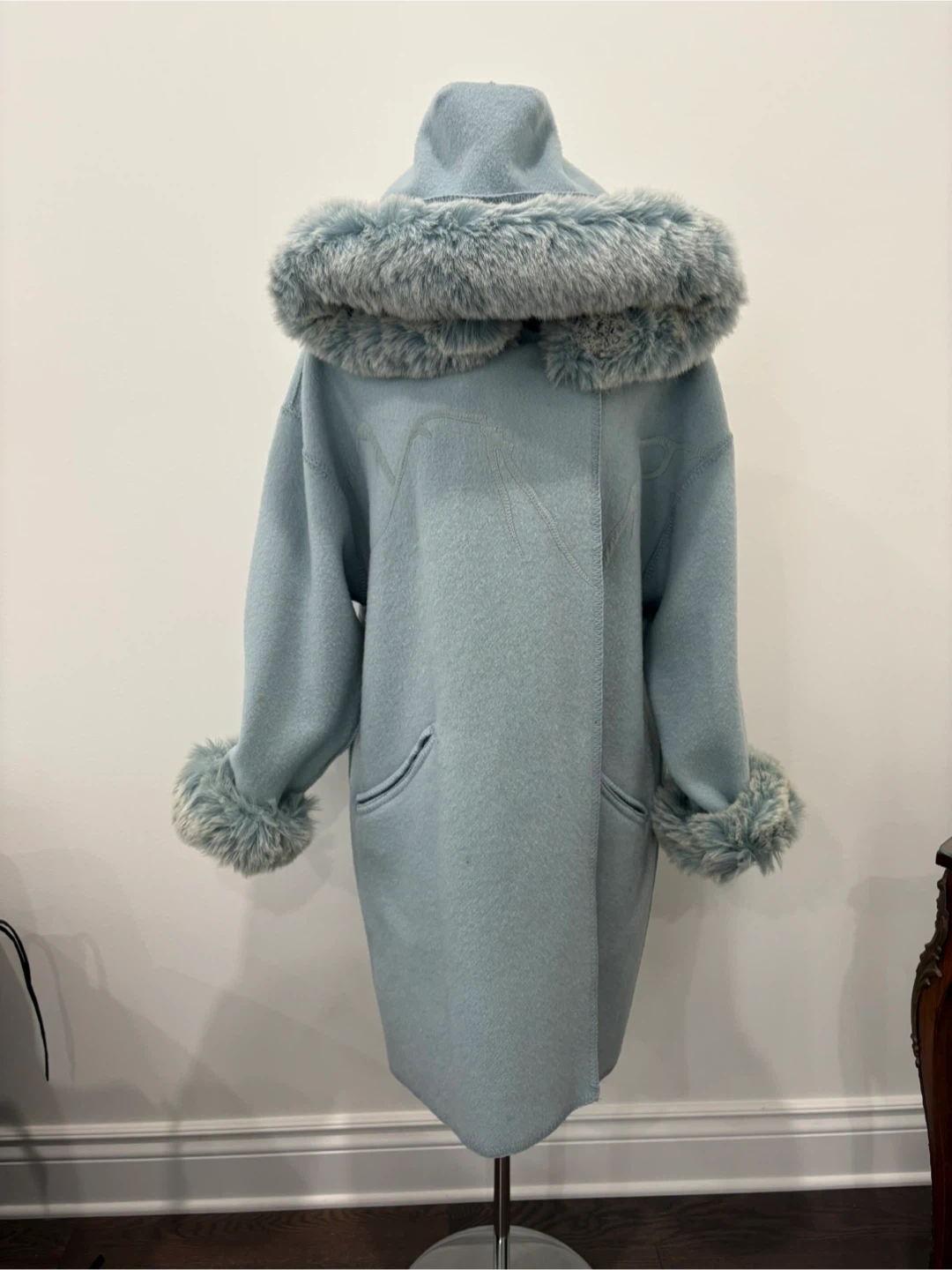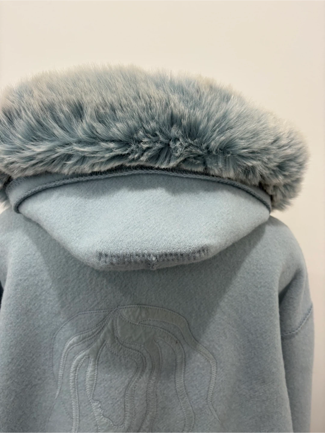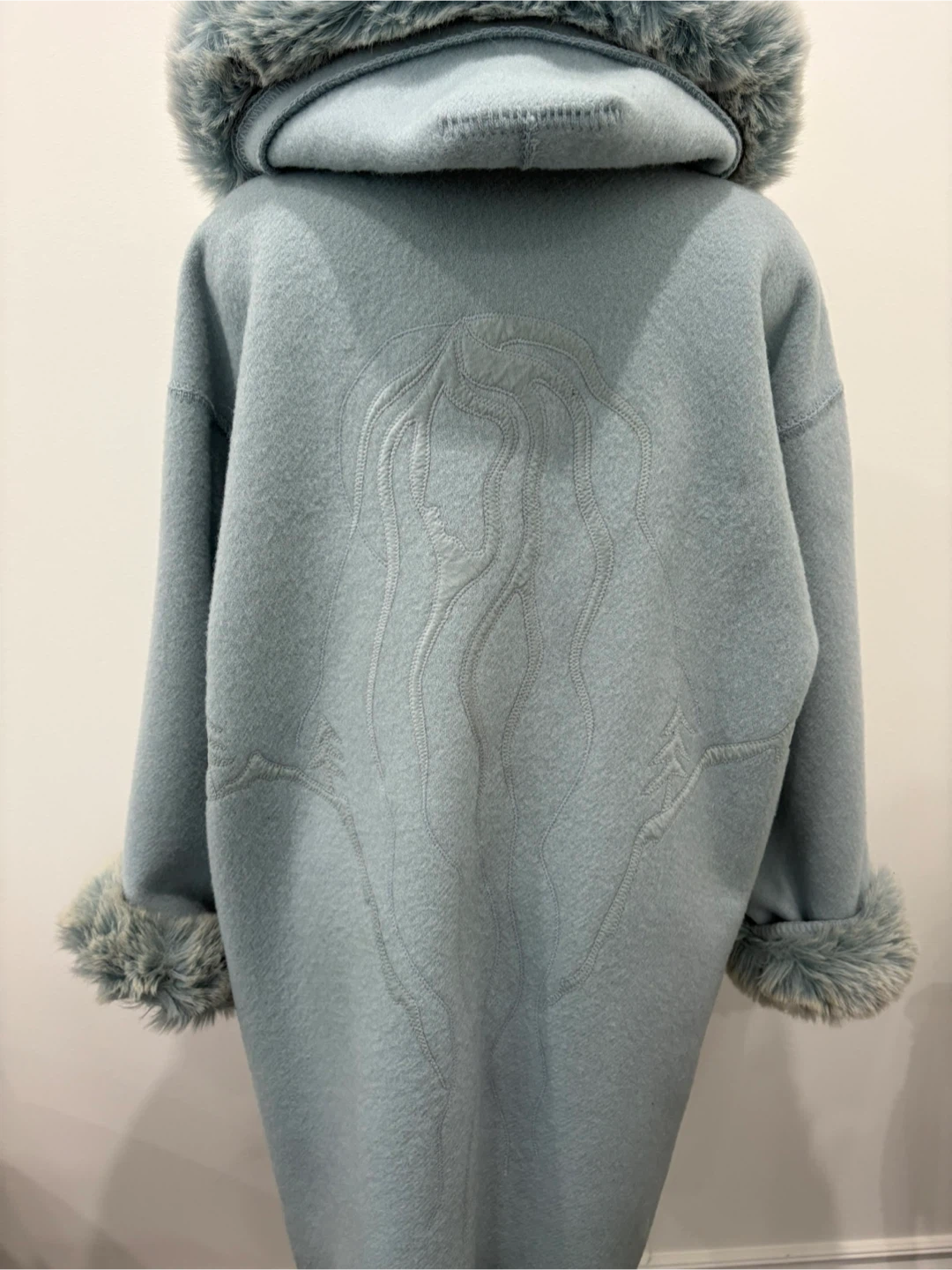 Rare vintage 1980’s Linda Lundström LaParka in boiled wool with embroidery on the front and back. Features removable faux fur hood trim, faux fur cuffs