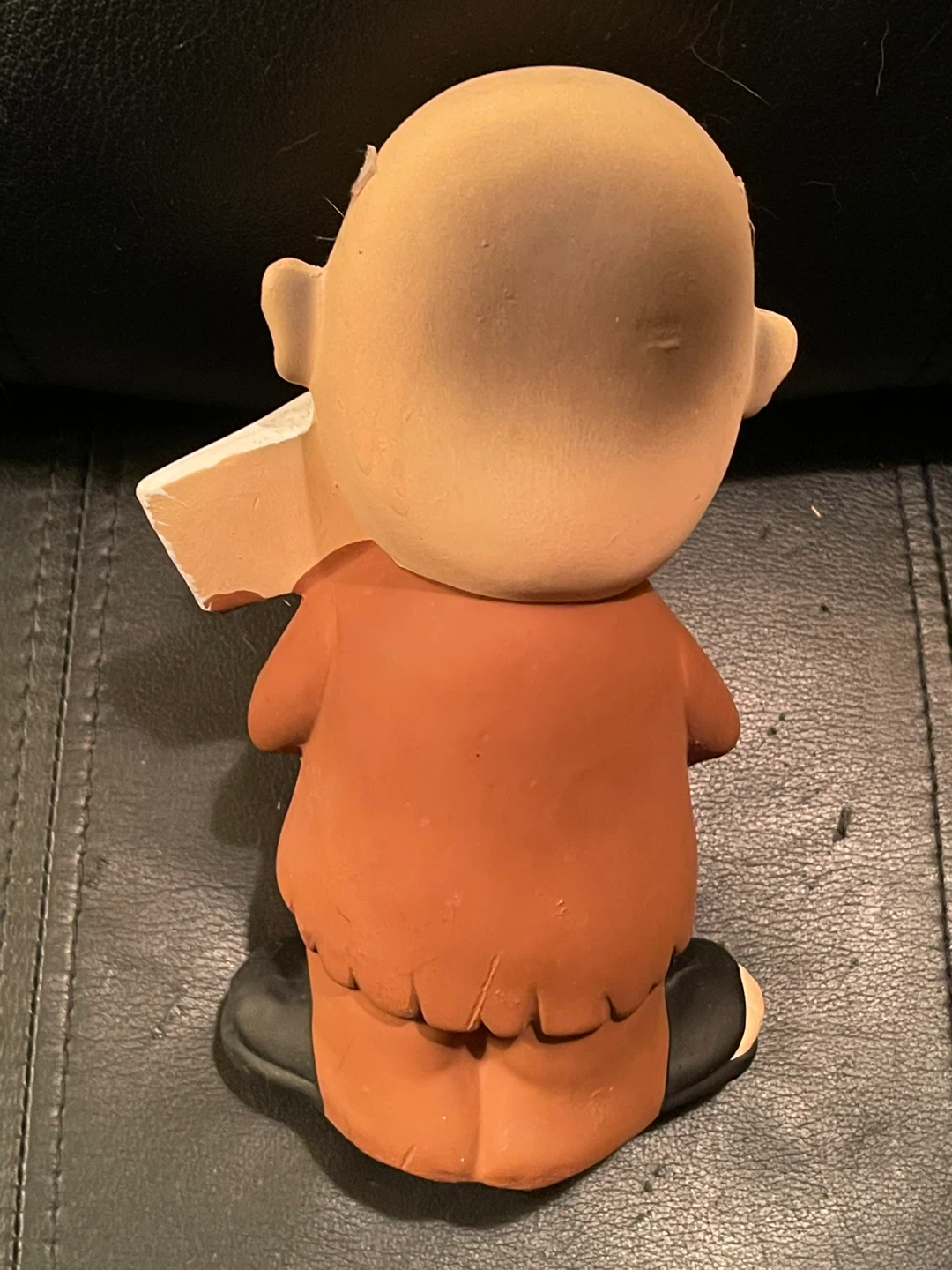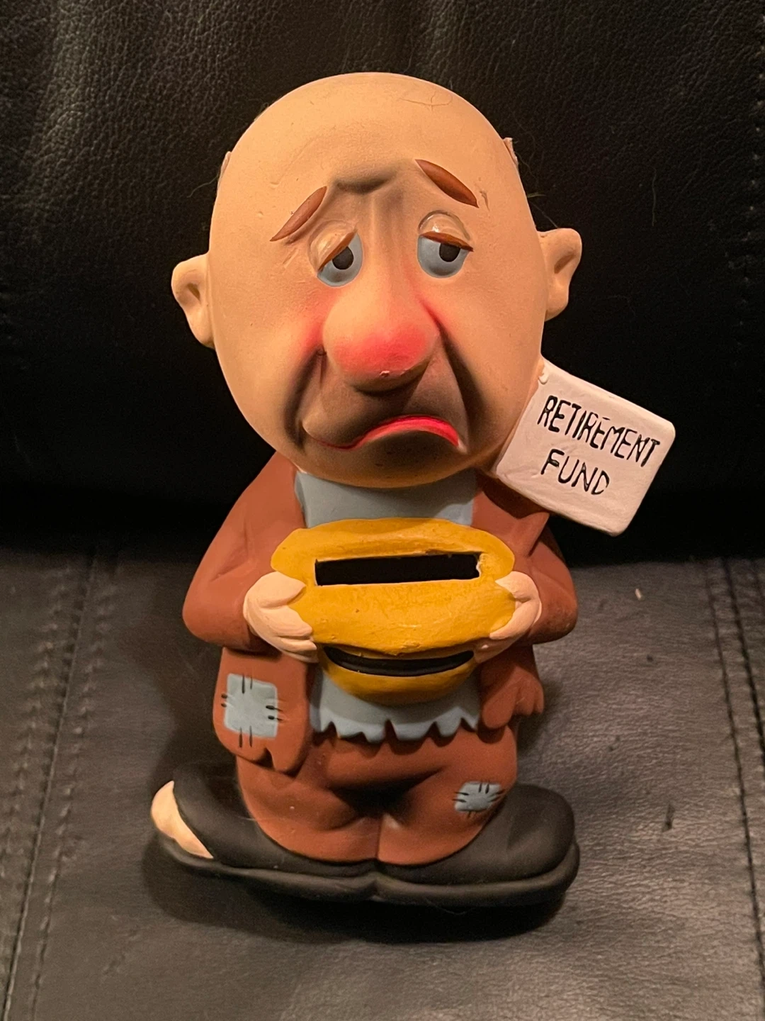 This is a vintage ceramic KK Originals coin bank shaped like a sad man holding a bowl. Made in Japan. It says "Retirement Fund" on a sign. It's in good condition with no chips or cracks but needs a new stopper or the existing one can be glued back together. 7 inches tall. Selling empty as I already retired and used the funds!