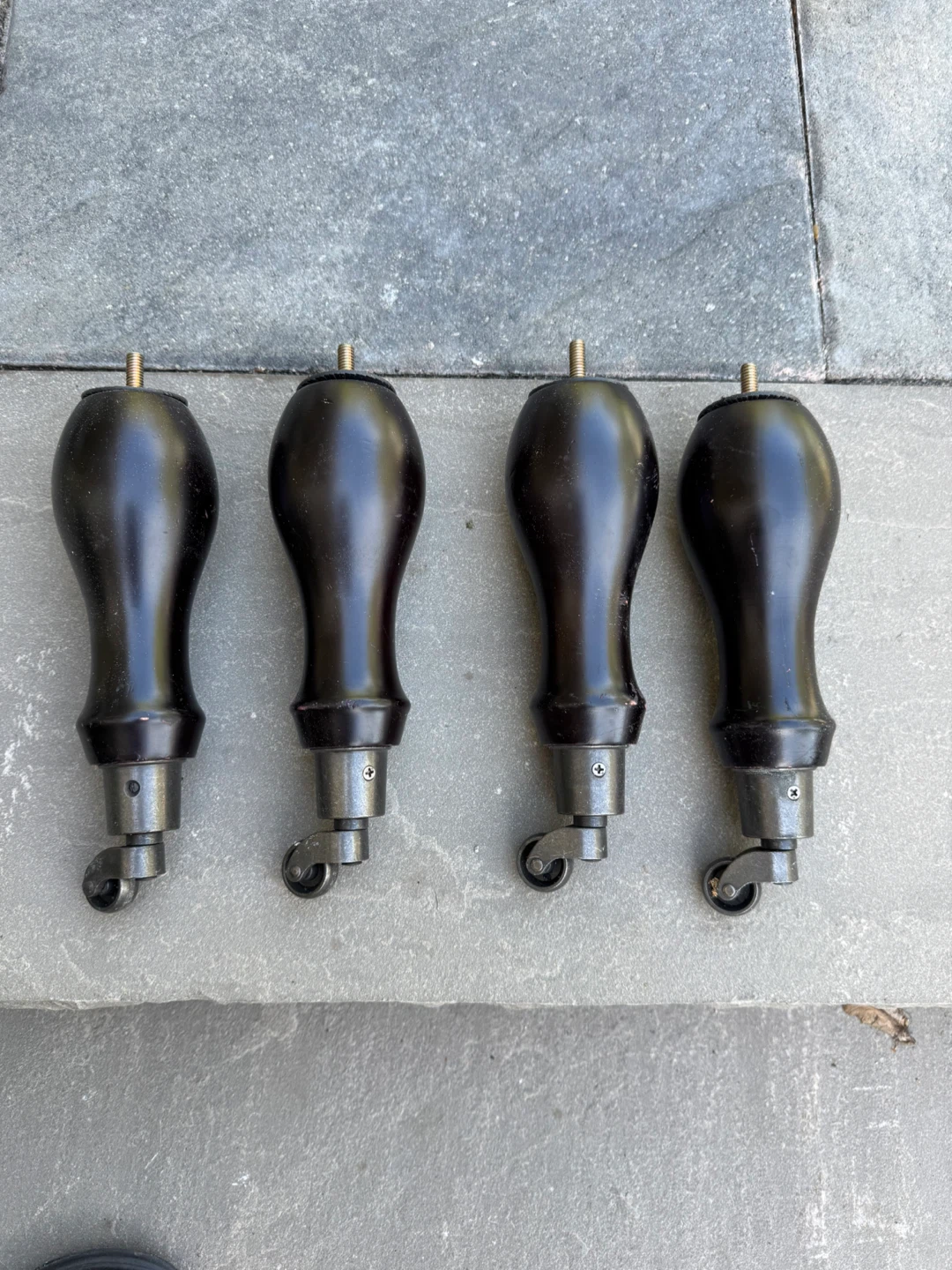 Selling a set of four furniture legs, perfect for adding a touch of elegance and mobility to your furniture. They are black and come with casters for easy movement. Great for sofas, chairs, or other furniture pieces!