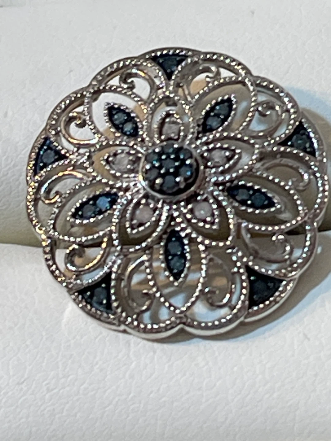 Selling a lovely 925 silver blue and white diamonds ring with a floral design. It features intricate detailing and small diamonds, perfect for adding a touch of elegance to any outfit!