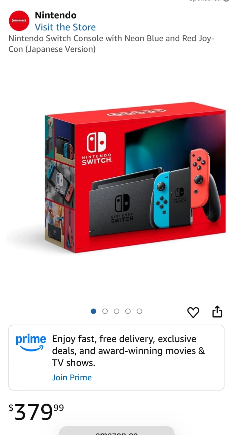 Selling a Nintendo Switch console with Neon Blue and Red Joy-Con. It comes in its original box. Retails for $379.99, used twice, bought wrong one for my son.