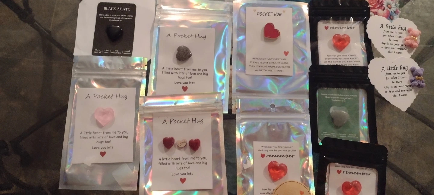 These adorable Valentine pocket hugs are a sweet little keepsake! Each one comes with a card that says 'A little heart from me to you, filled with lots of love and big hugs too! Love you lots'. Perfect for clipping on your purse or keys as a reminder that someone cares
