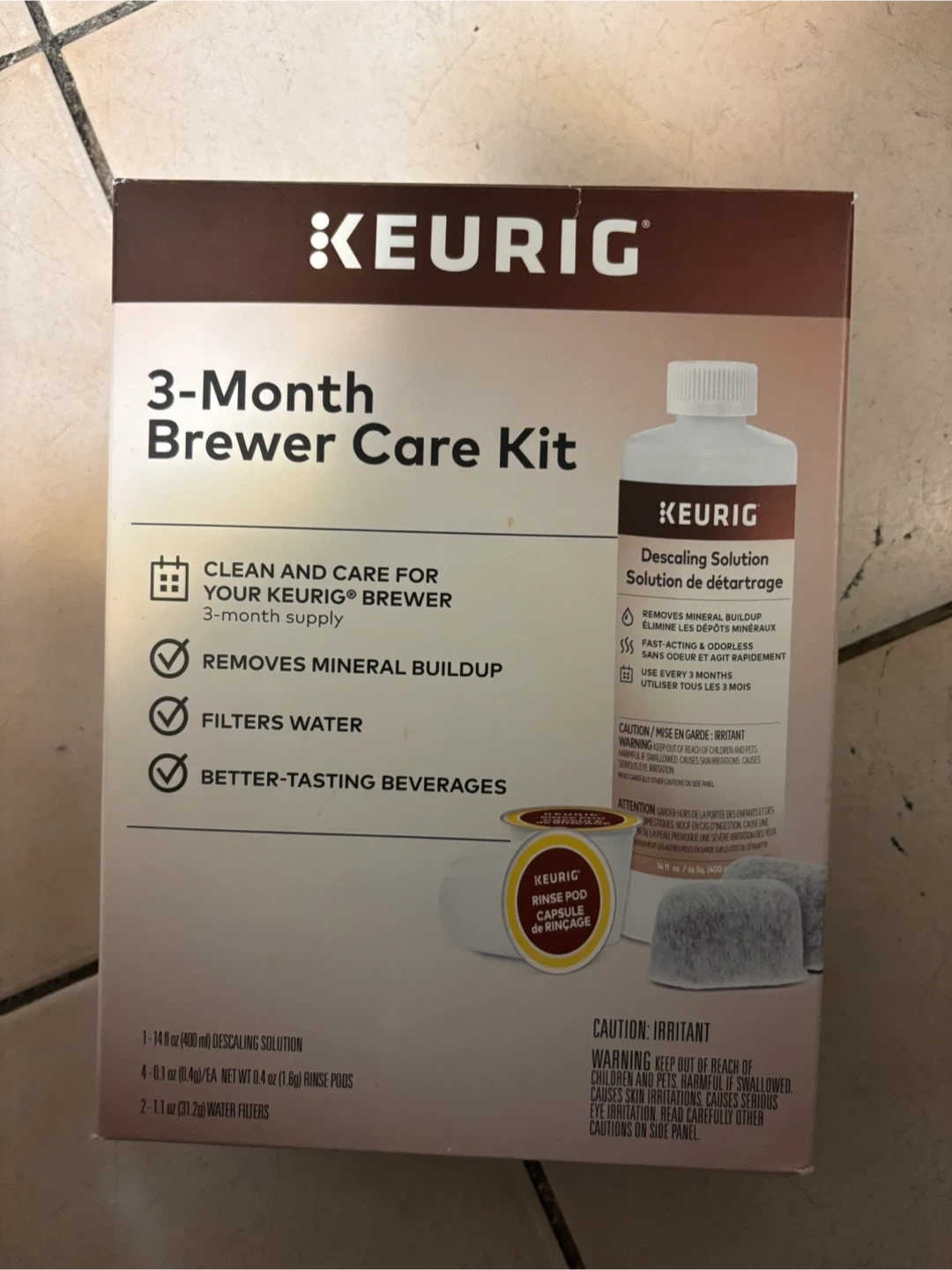 Get ready to brew with this Keurig K-Express Essentials coffee maker! It features 3 cup sizes and is space-saving. Also included is a 3-month brewer care kit to keep your Keurig in tip-top shape. Coffee machine needs to be descaled. I already used the Descaling Solution in the past so only the rinse pods and water filter cartridges are remaining in the brewer care kit. I’ll throw in some coffee pods but they’re expired so if you don’t want the pods just let me know. The two boxes of coffee pods are not full boxes, some pods have been used before.