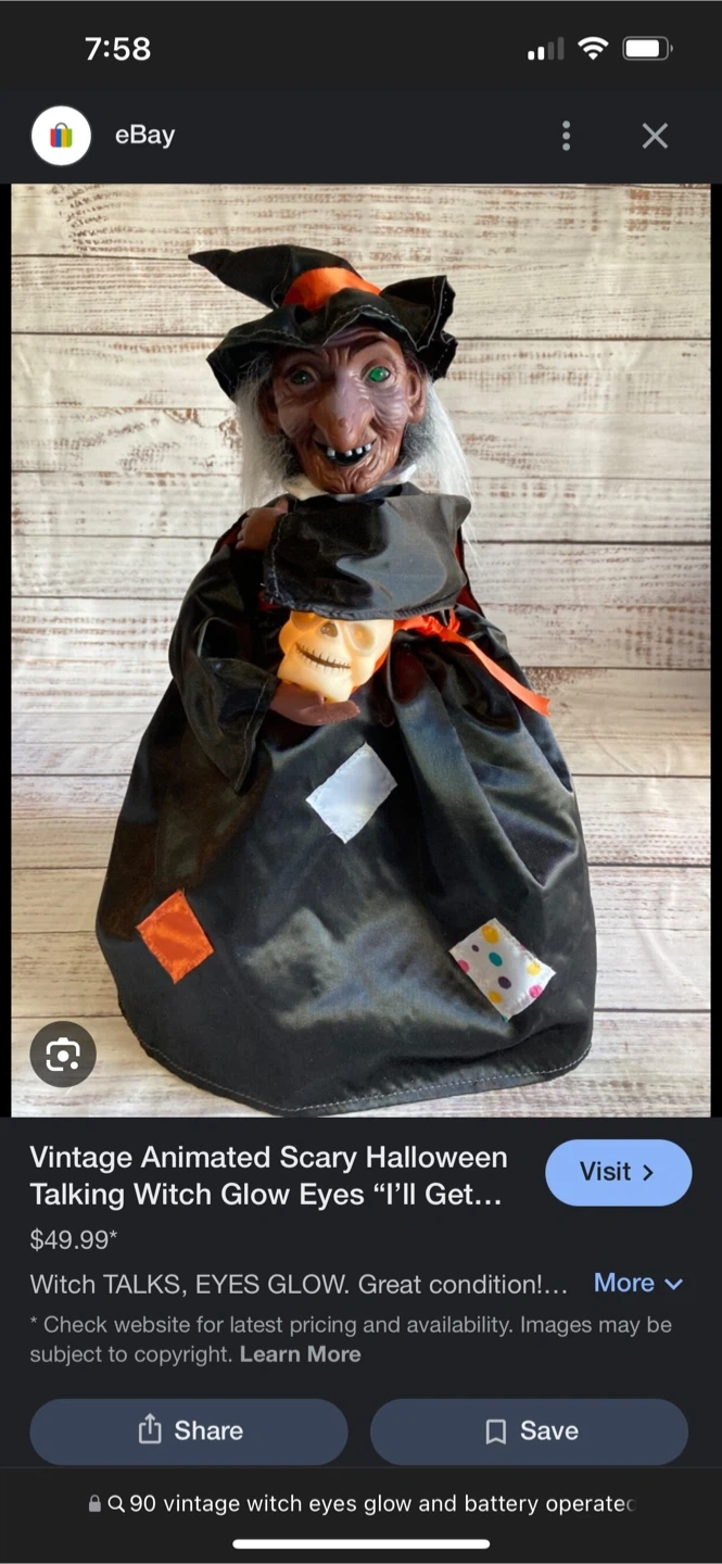 Selling a Halloween witch decoration. It's in great condition and ready to add some spooky charm to your home this season! Features a classic witch design with a skull and broom.plays scary music and eyes light up battery operated. From the 90 retails 50 selling only for 15