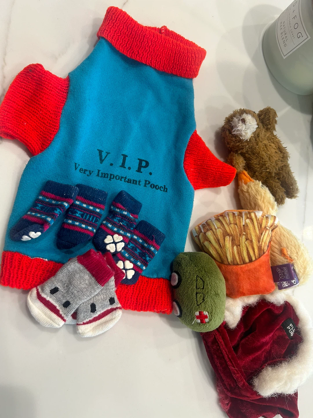 Selling a collection of dog items! Includes a cute "V.I.P. Very Important Pooch" outfit, some adorable dog socks, and a few plush toys for your furry friend. Also a Christmas scarf for dog in for free. Great for small dogs!
