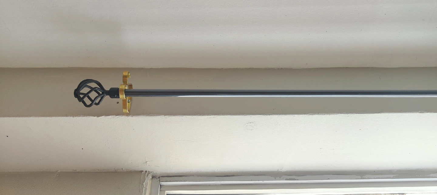 215Here's a curtain rod that's ready to hang! It features a black rod with gold accents on the ends and brackets. It's in good condition and would look great in any room