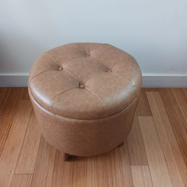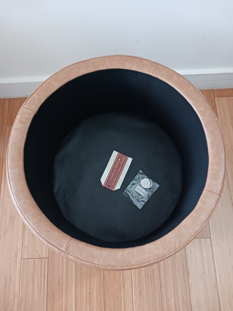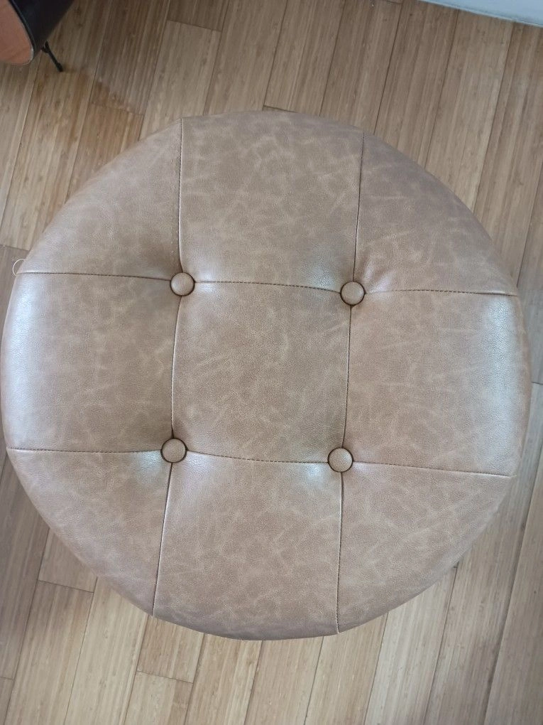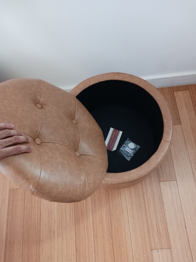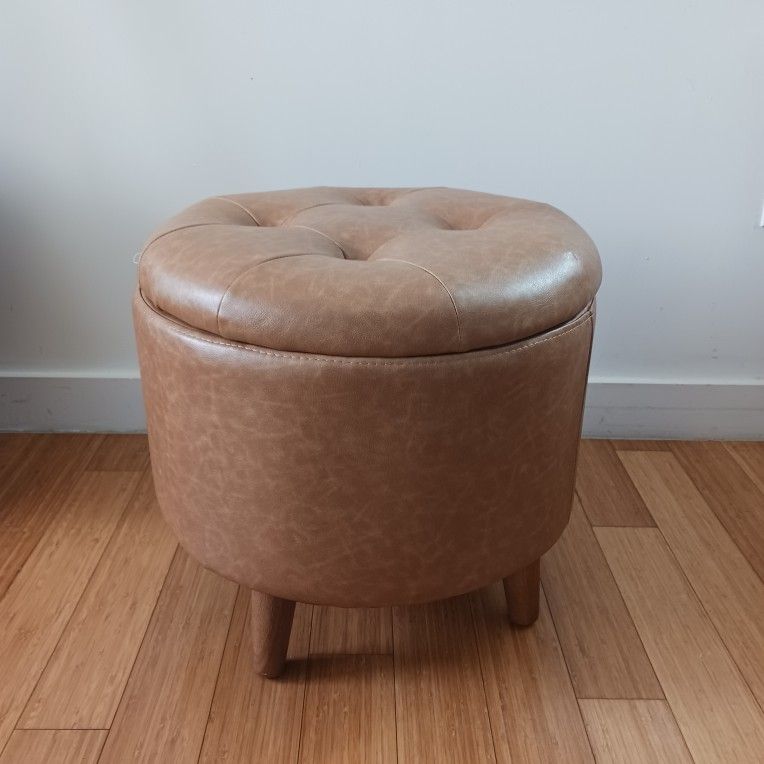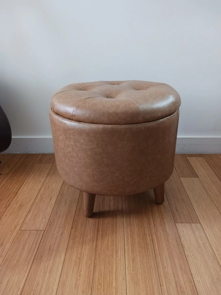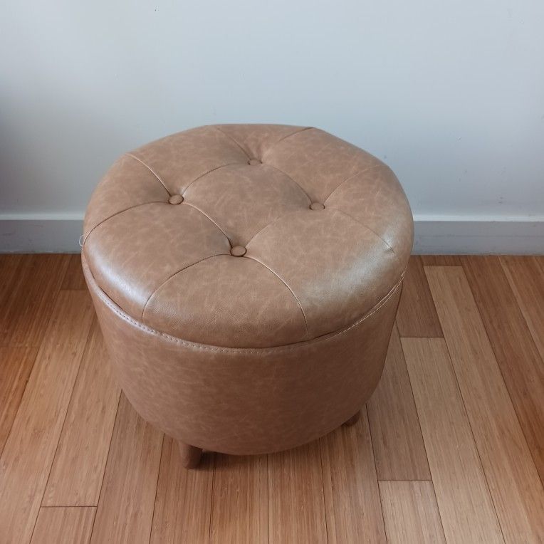 Round Tan Storage Ottoman – Faux Leather Footstool with Lid