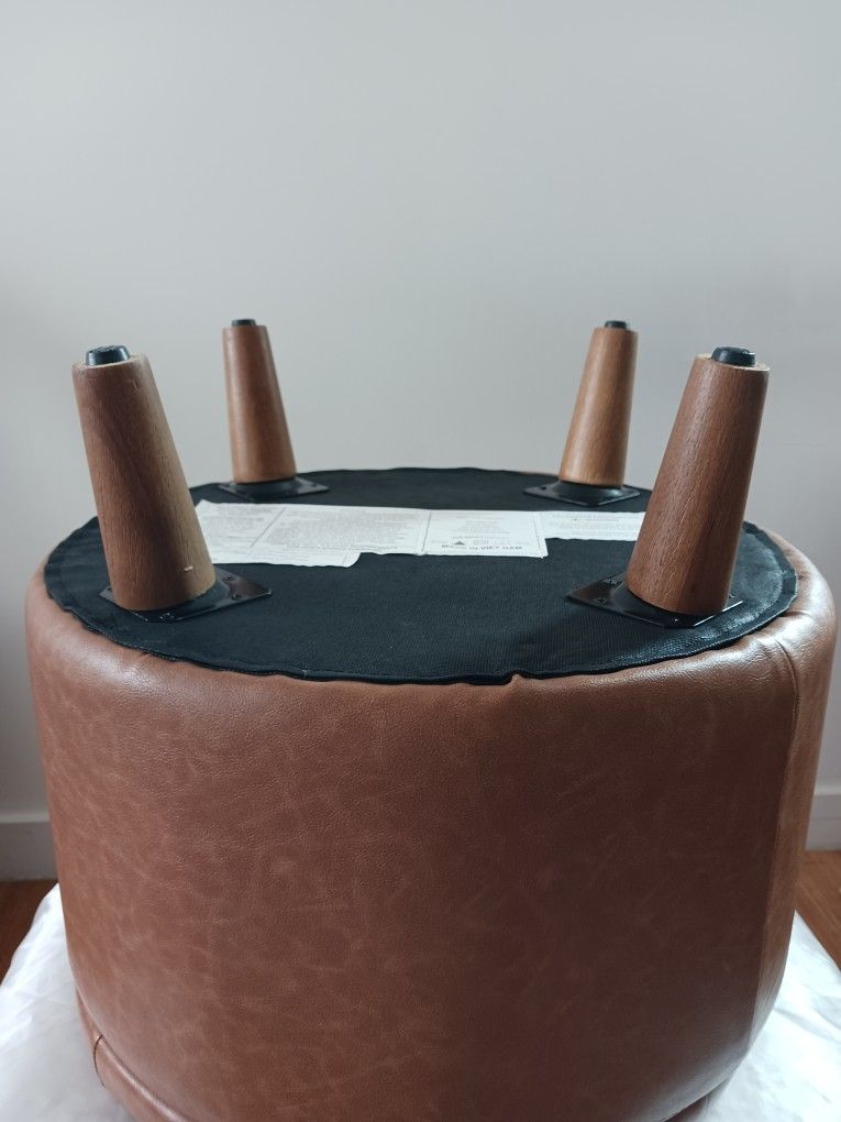 Modern tan faux leather ottoman with hidden storage and wooden legs. A stylish and functional accent piece is perfect for any living room, bedroom, or entryway.