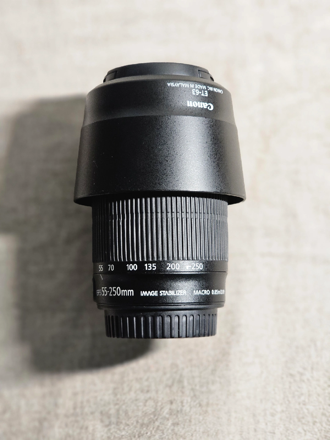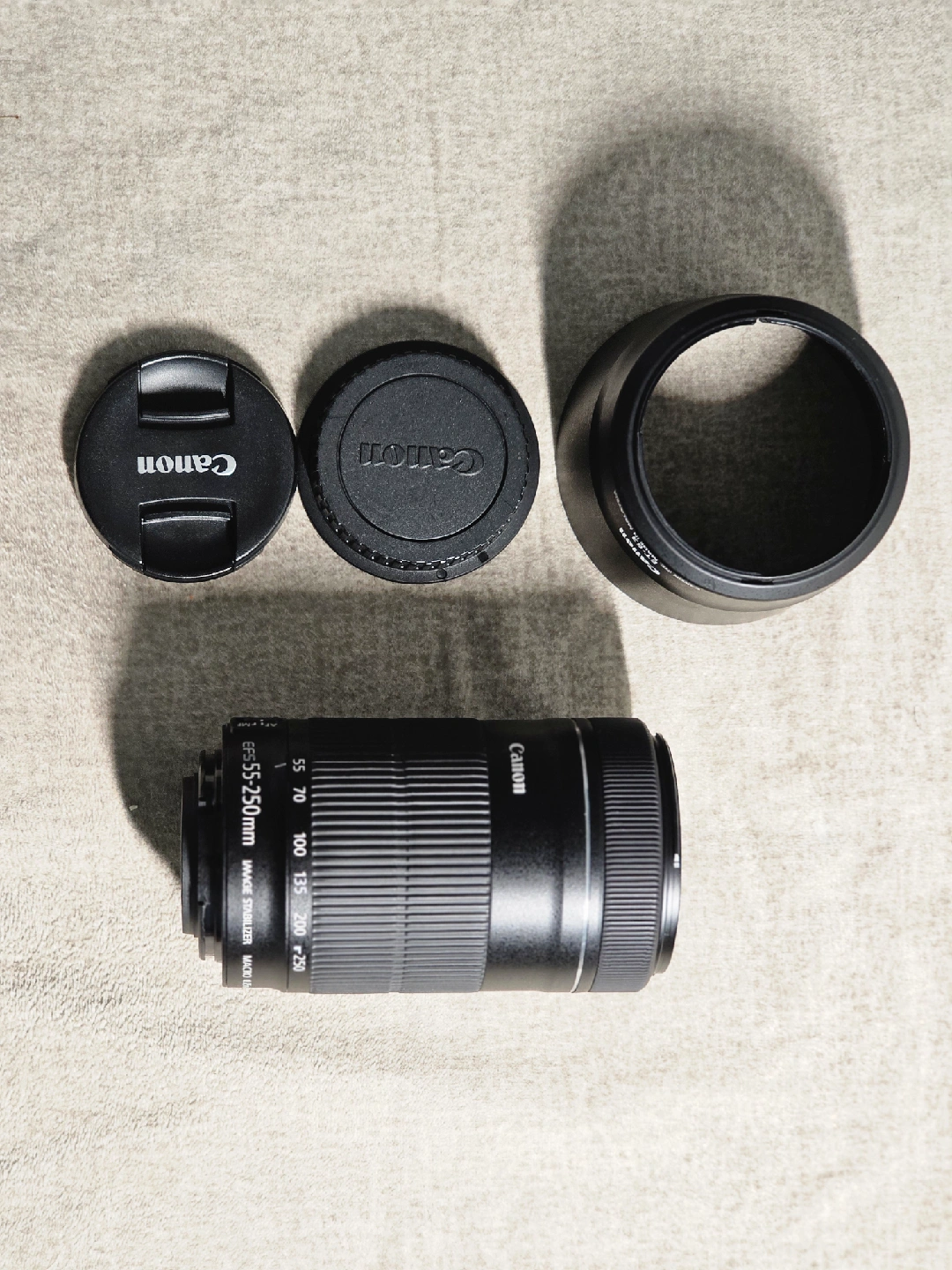 118Selling a Canon EF-S 55-250mm f/4-5.6 IS STM lens. It's in great shape and ready for a new home! This lens is perfect for capturing those far-away shots with clarity and precision. Includes the lens hood ET-63.
