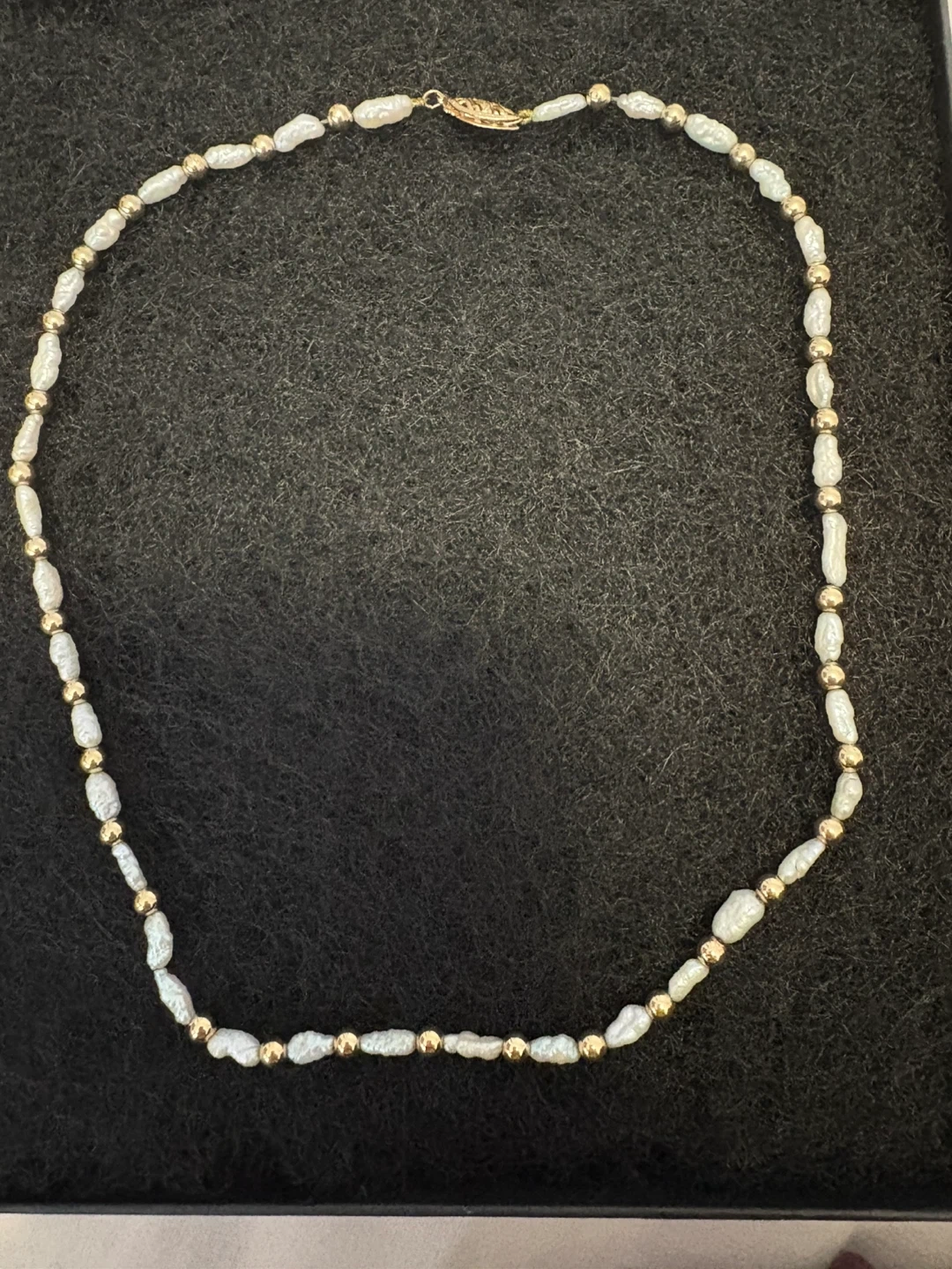 Genuine Rice Pearl and 14 karat Gold Bead Necklace