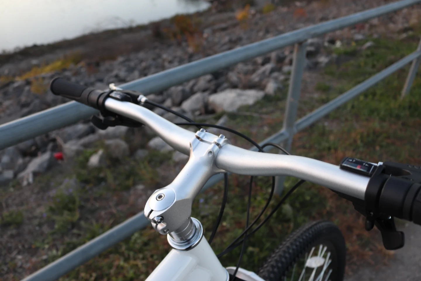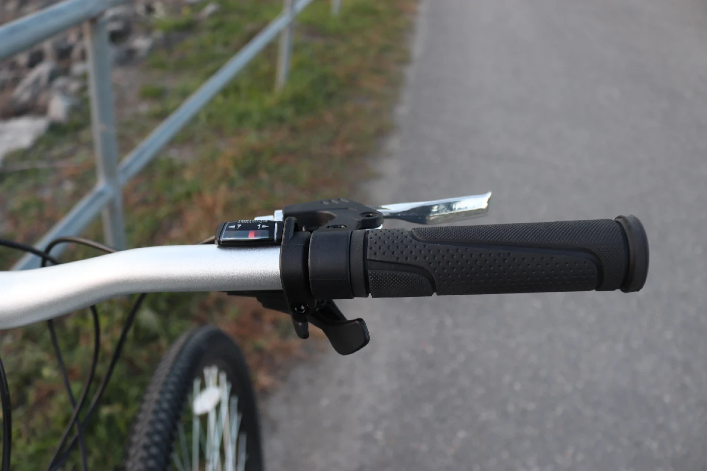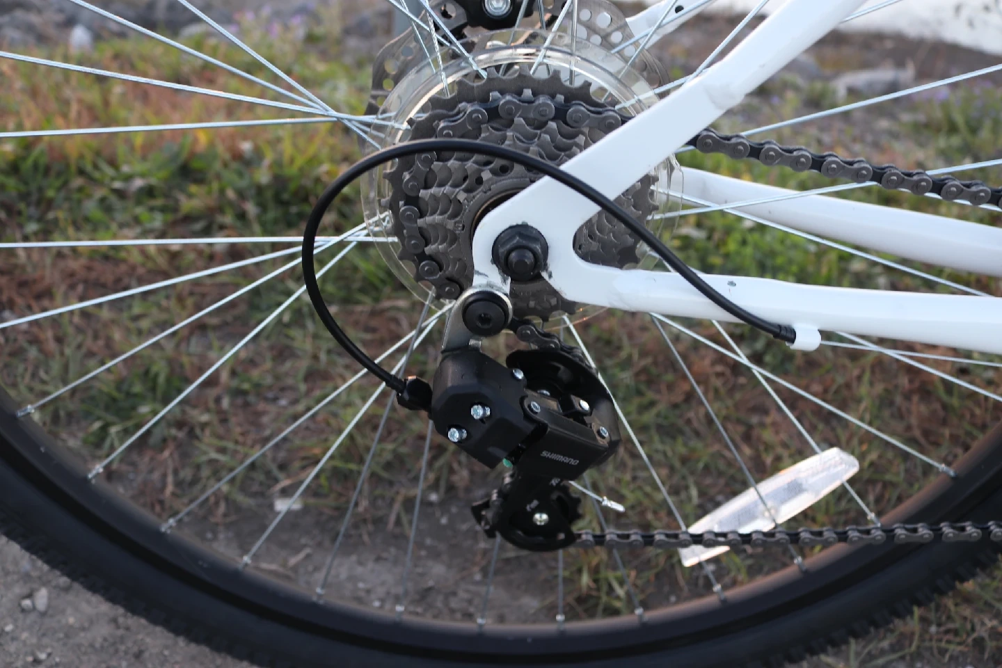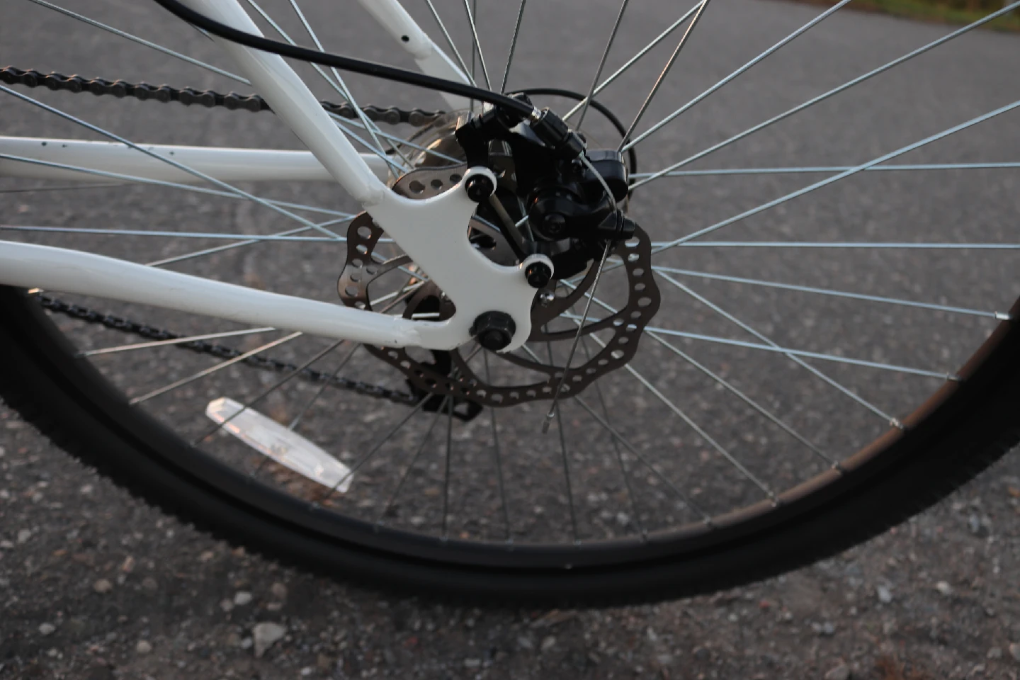 The bike has disc brakes front and back. The gears shift smoothly. The tires are in almost new condition. The suspension fork works well.