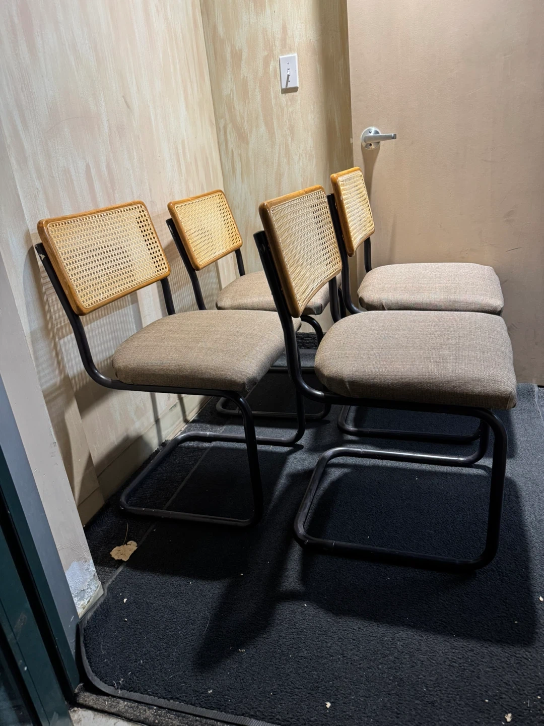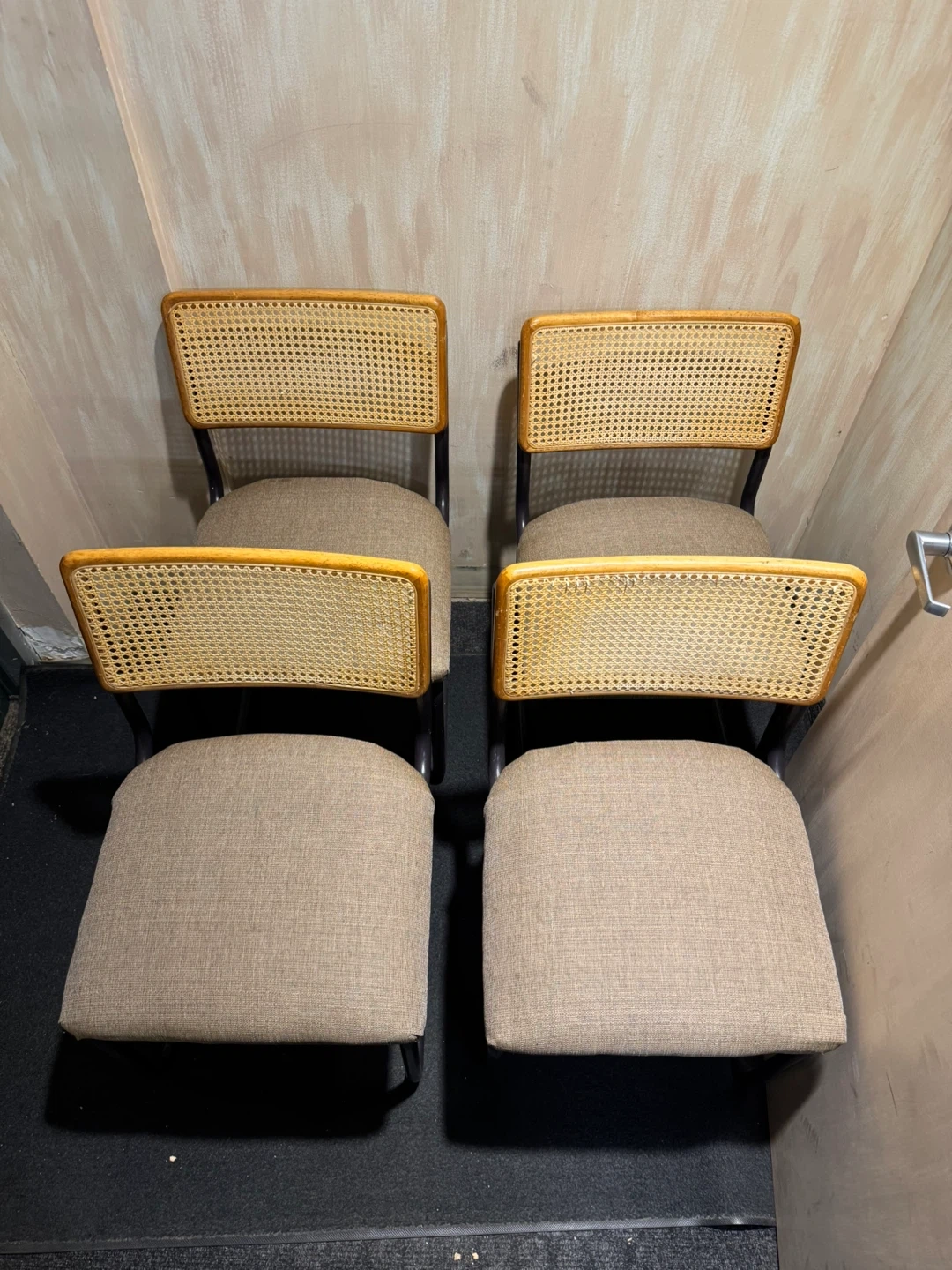 Selling a set of four dining chairs. They feature a rattan back and neutral-toned seat. Perfect for adding a touch of natural texture to your dining space!