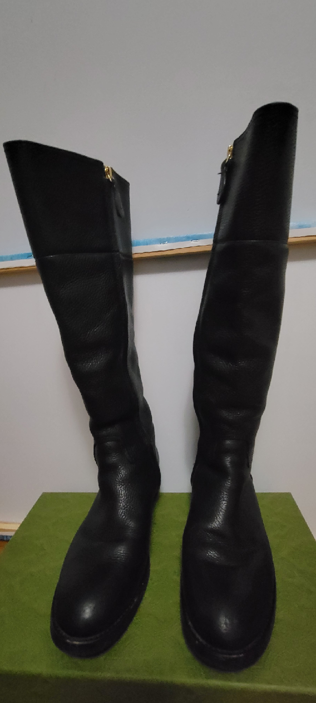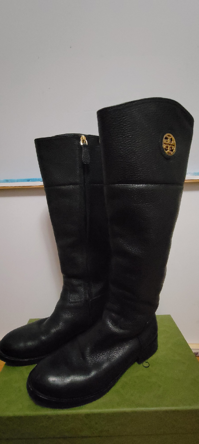 Selling a pair of Tory Burch riding boots in black leather. They are in good condition and feature a gold logo detail on the side. The size is 6.5M.