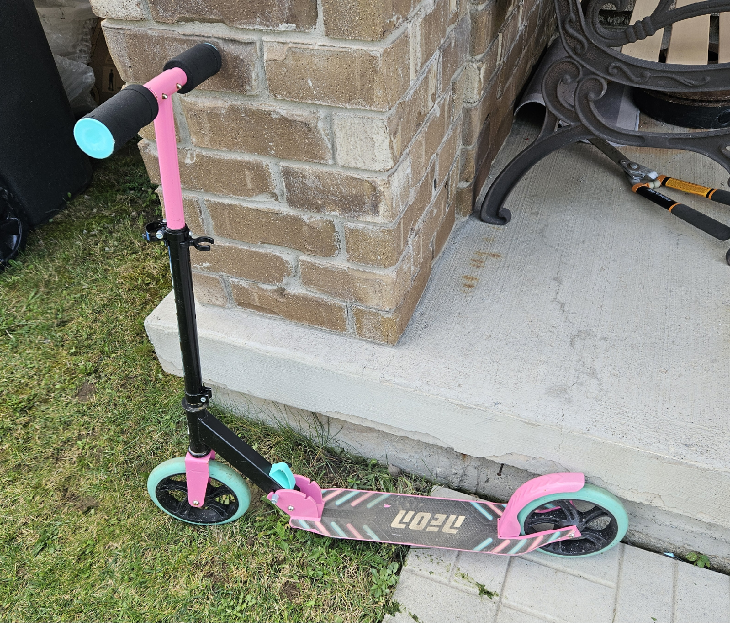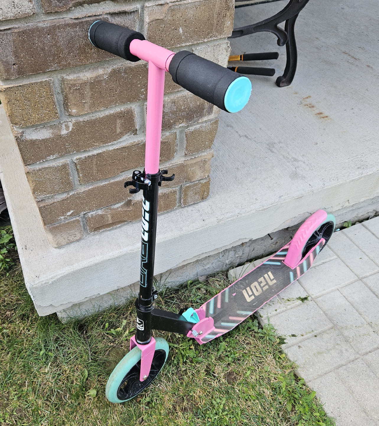 Selling a Neon Flash folding kick scooter in pink and black! It's in great shape and ready for some fun rides. The scooter is designed to be lightweight and portable, making it easy to carry and store when not in use. Perfect for kids who love to scoot around the neighbourhood!