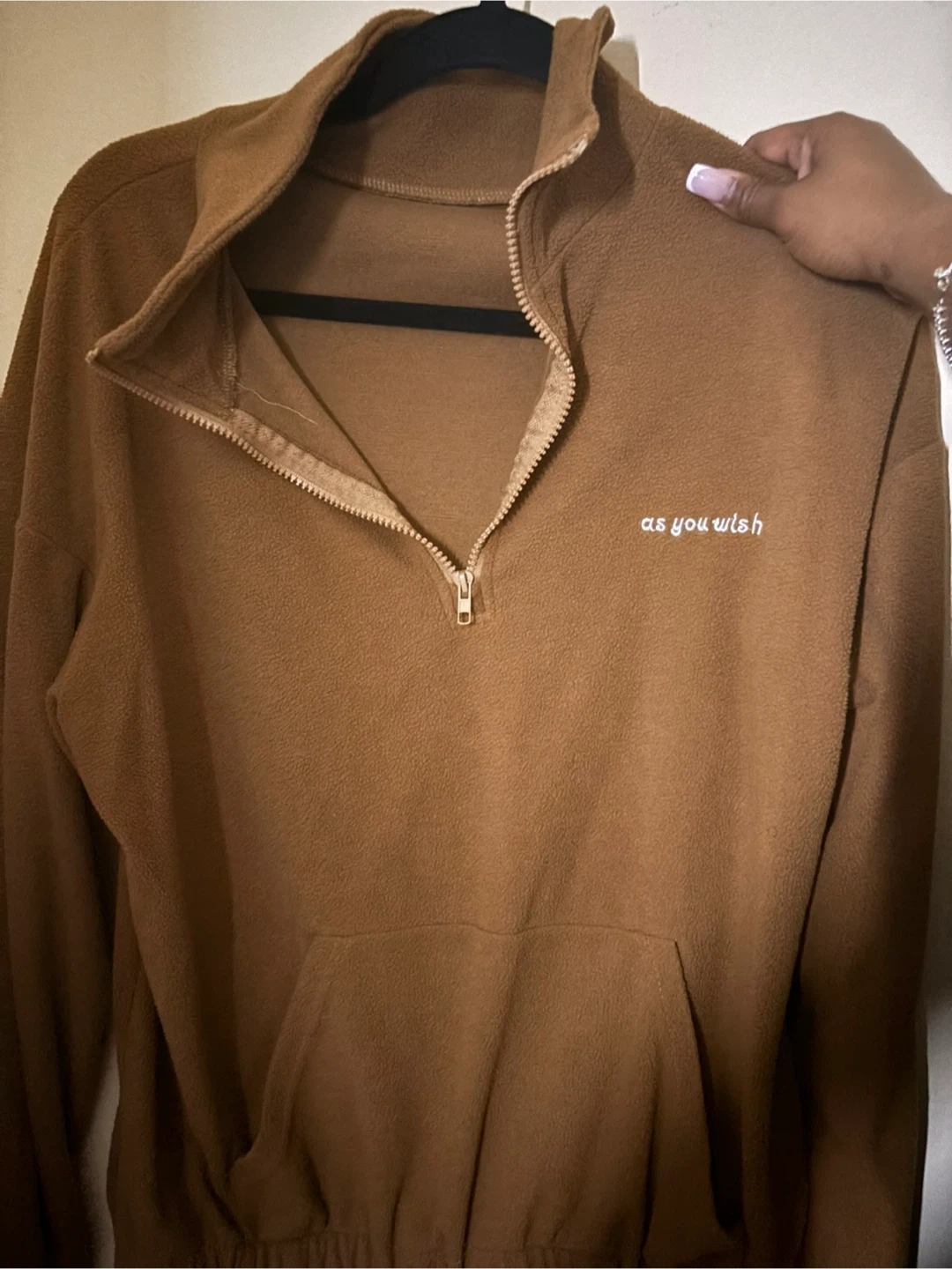 Cozy brown fleece pullover with a quarter zip and front pocket. The brand is As You Wish. Great for layering on chilly days.