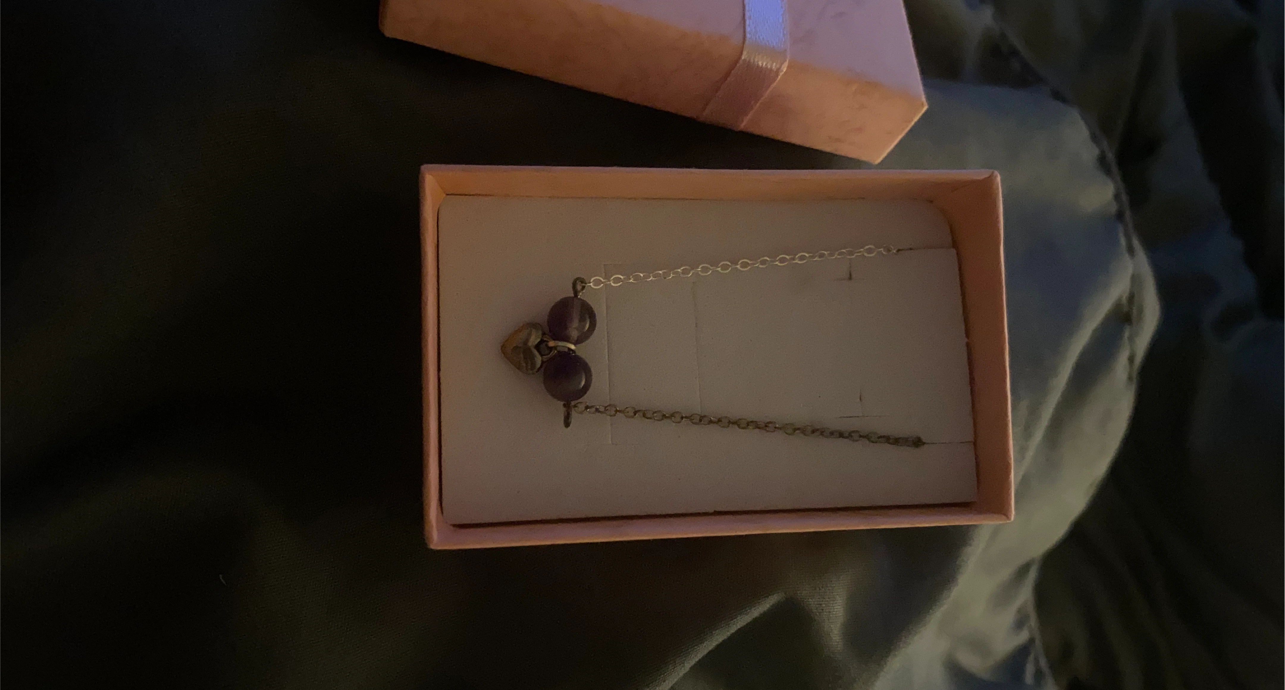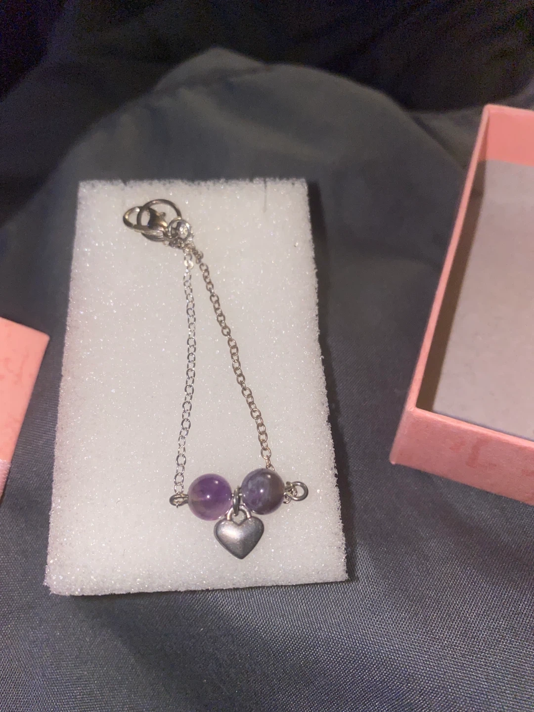 Selling a cute charm bracelet from Faith's Crystal Creations! It features purple beads and a heart charm. Comes in its original box, perfect for gifting or keeping it safe