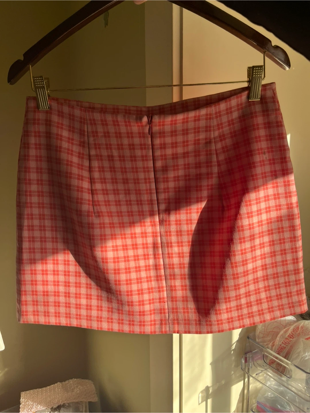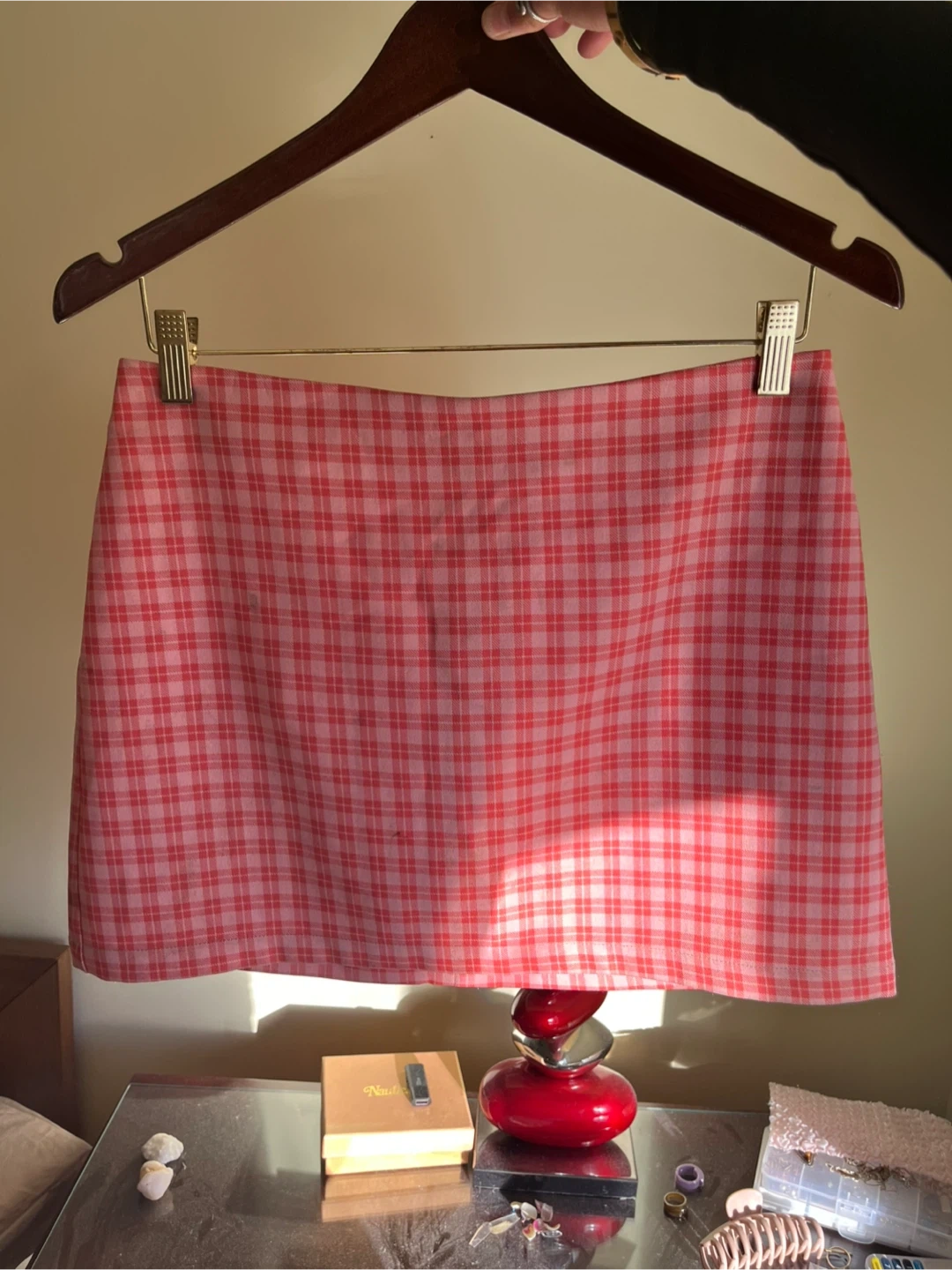 28Selling a cute pink plaid mini skirt! It's in great condition and perfect for spring or summer. The skirt has a classic plaid pattern in shades of pink. It's a stylish addition to any wardrobe!