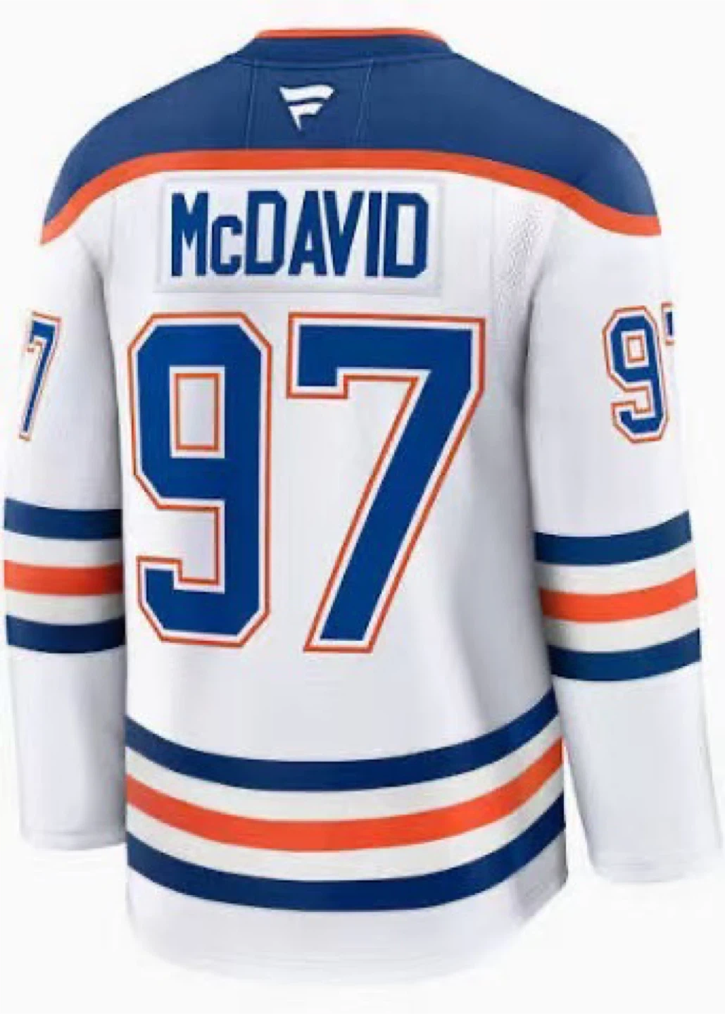 Selling an Edmonton Oilers hockey jersey with McDavid's name and number (97) on the back! The jersey is blue and orange with the Oilers logo on the front. A great way to show your team spirit!