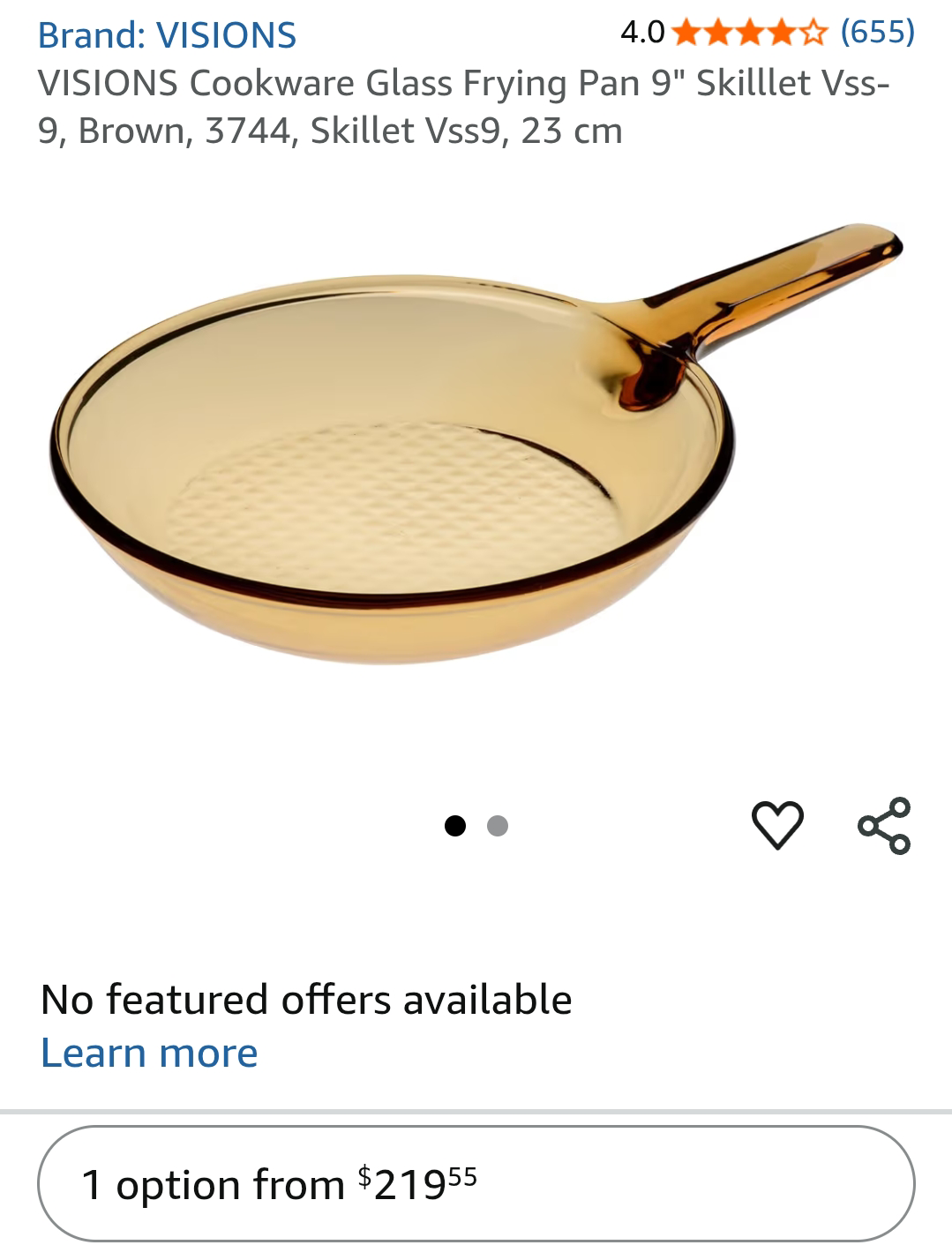 1 / 11 / 1Buy & SellVISIONS Cookware Glass Frying Pan 9" Skillet π₯VISIONS Cookware Glass Frying Pan 9" Skillet π₯$35Selling a VISIONS cookware glass frying pan. It's a 9-inch skillet, model Vss-9. It's brown and 23 cm. Retails for $219.55WHERE TO MEET40 Bay Mills BlvdView MapSELLERverifiedArcherTam O'Shanter1000+181 reviews1 chatsΒ·6 favoritesΒ·69 viewsSEND CHAT TO SELLERHi Archer! Iβm interested in your listing.Hi Archer! Iβm interested in your listing.Get the Karrot app to chatSign In to chat