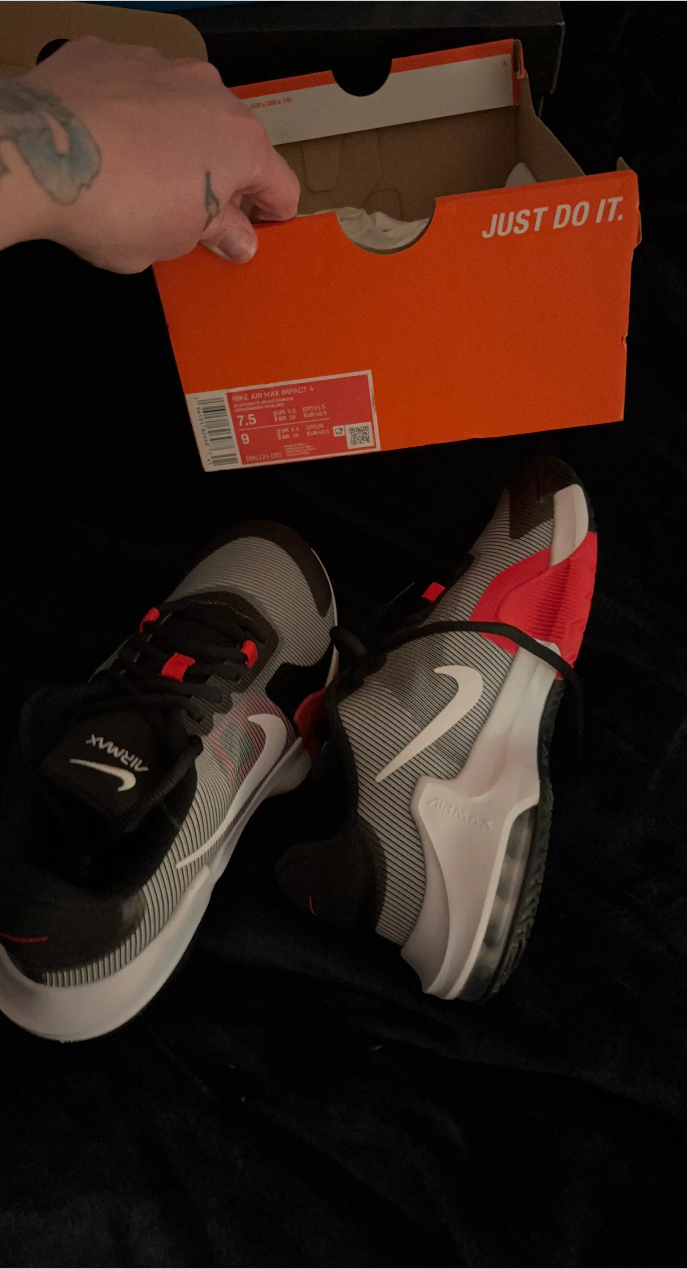 Selling a pair of Nike Air Max Impact 4 sneakers in size 7.5 (US). The colours are black, white, and shot crimson. They come with the original box!