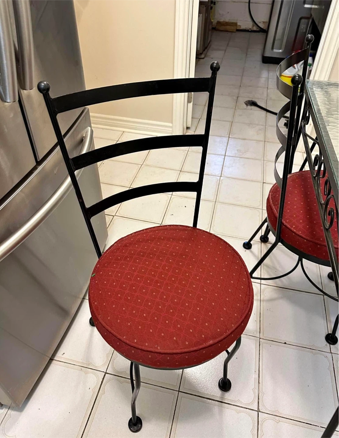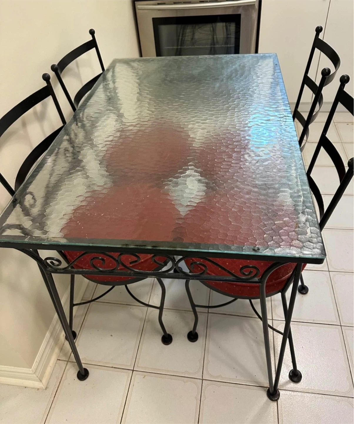 Selling a dining table with a glass top and four chairs! The chairs have a red patterned cushion and a black metal frame. The table also has a black metal frame. It's a great set for a smaller dining area or kitchen. Ready for a new home!