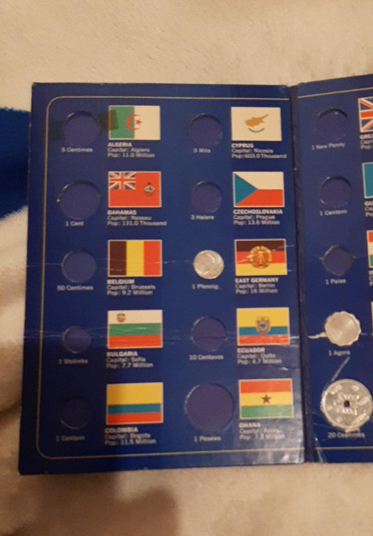 This is a display for a coin collection. It features labeled slots for coins from countries like Algeria, Bahamas, Belgium, Bulgaria, Colombia, Cyprus, Czechoslovakia, East Germany, Ecuador, and Ghana. A great way to showcase your collection!