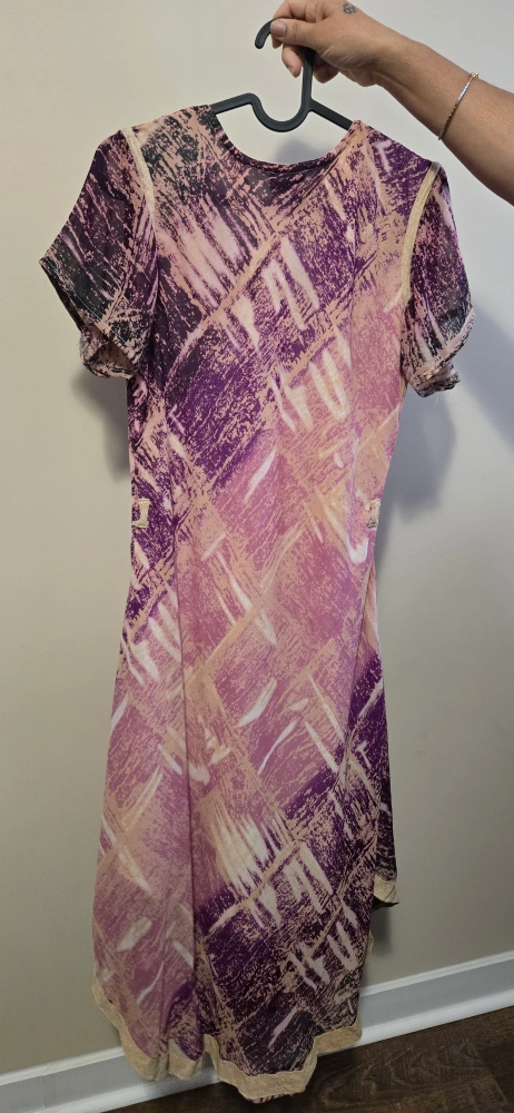Selling a pretty purple patterned dress in size 2XL. It has a unique design and is in great condition. Perfect for a casual outing or a special occasion!