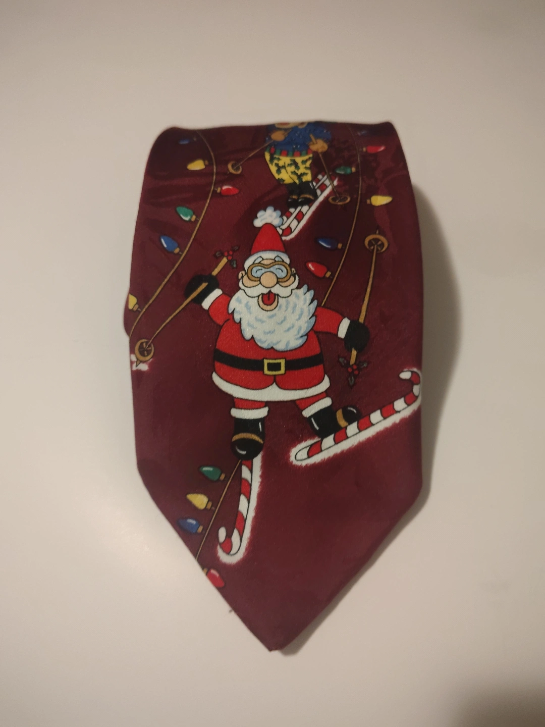 91Add some festive cheer to your wardrobe with this fun Christmas-themed necktie! It features Santa and reindeer on skis, surrounded by Christmas lights. The tie has a deep red colour and a 'HO-HO-HO' tag on the back. Perfect for the holiday season!