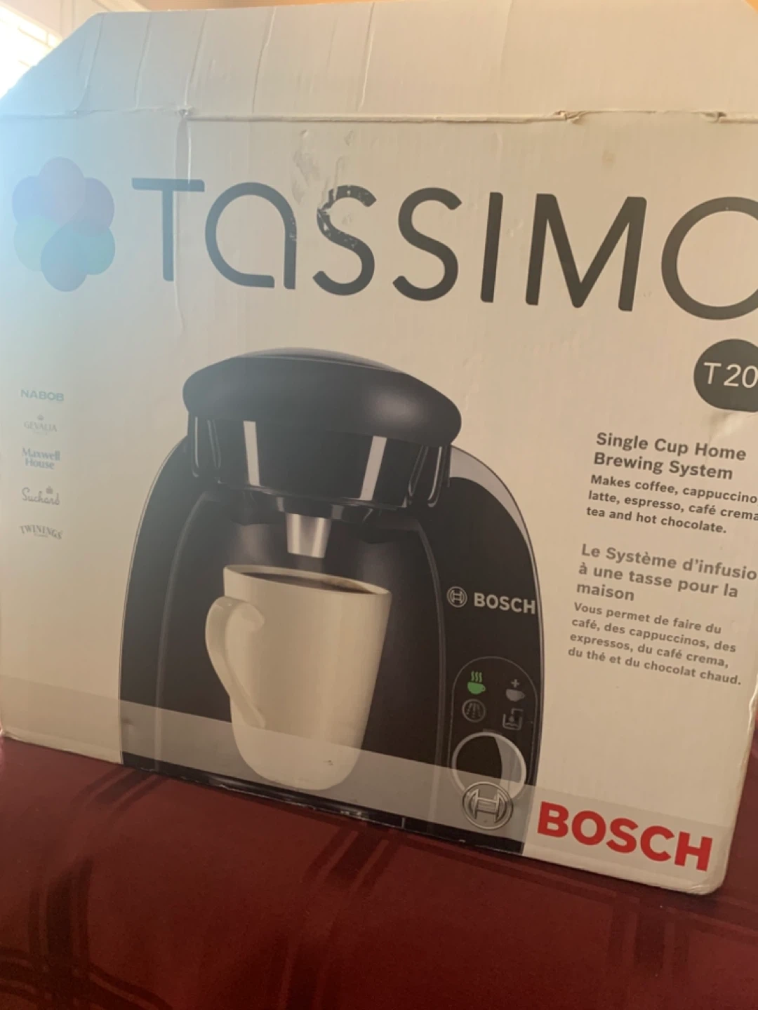 Selling a Bosch Tassimo T20 single-cup home brewing system. It's perfect for making coffee, cappuccino, latte, espresso, café crema, tea, and hot chocolate. The system is in excellent condition and comes with the original box