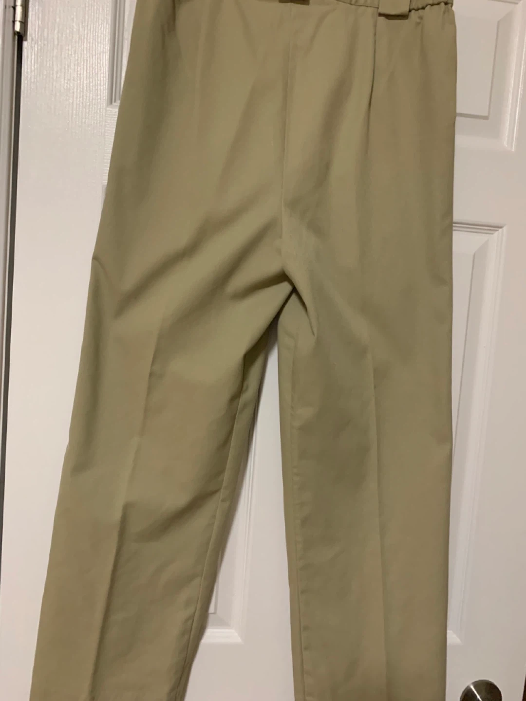 Here are some Tilley Endurables khaki pants. They are made in Canada and are 65% polyester and 35% cotton. They are in good condition and ready for a new home!