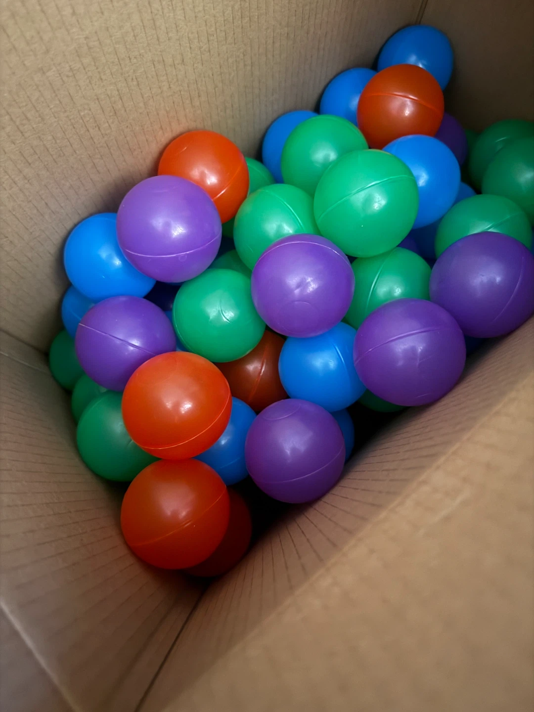 Selling colourful plastic play balls! Great for kids to play with in a ball pit, playhouse, or just around the house. There's a mix of red, purple, green, and blue balls. Hours of fun! I stopped counting after 75.