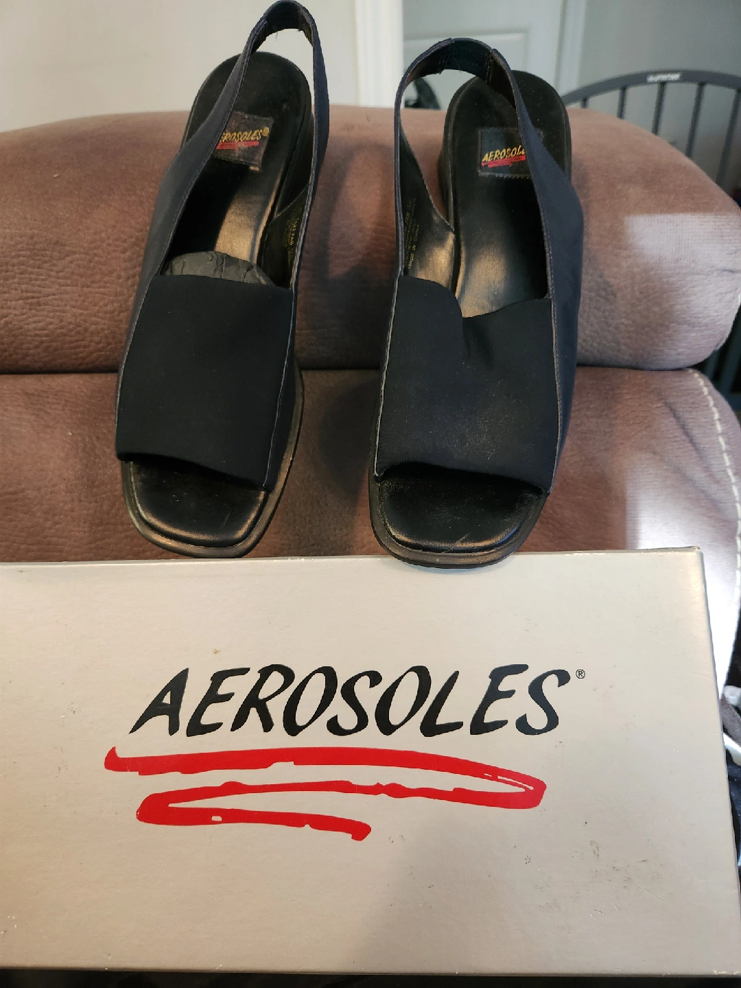 444Selling a pair of Aerosoles Robin heels in black, size 8.5. The shoes feature a leather/fabric upper and synthetic sole. The original box is included!