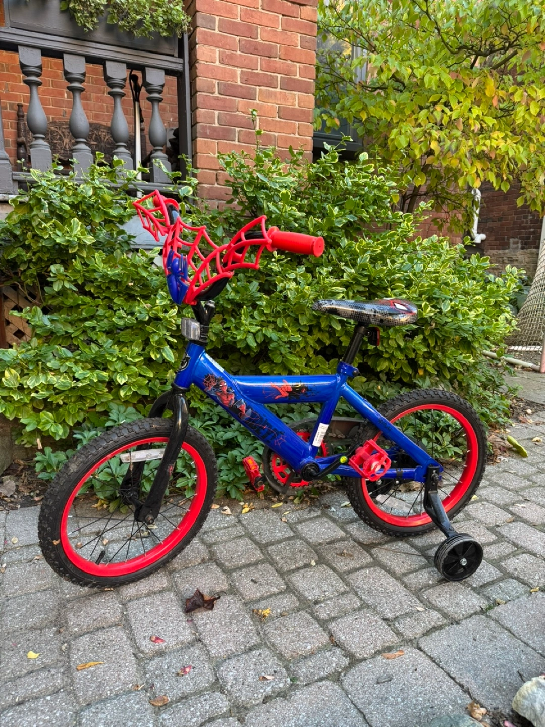 Selling a fun Spider-Man themed kids' bike! It's blue and red, perfect for any young fan. It has training wheels, so it's great for learning to ride.