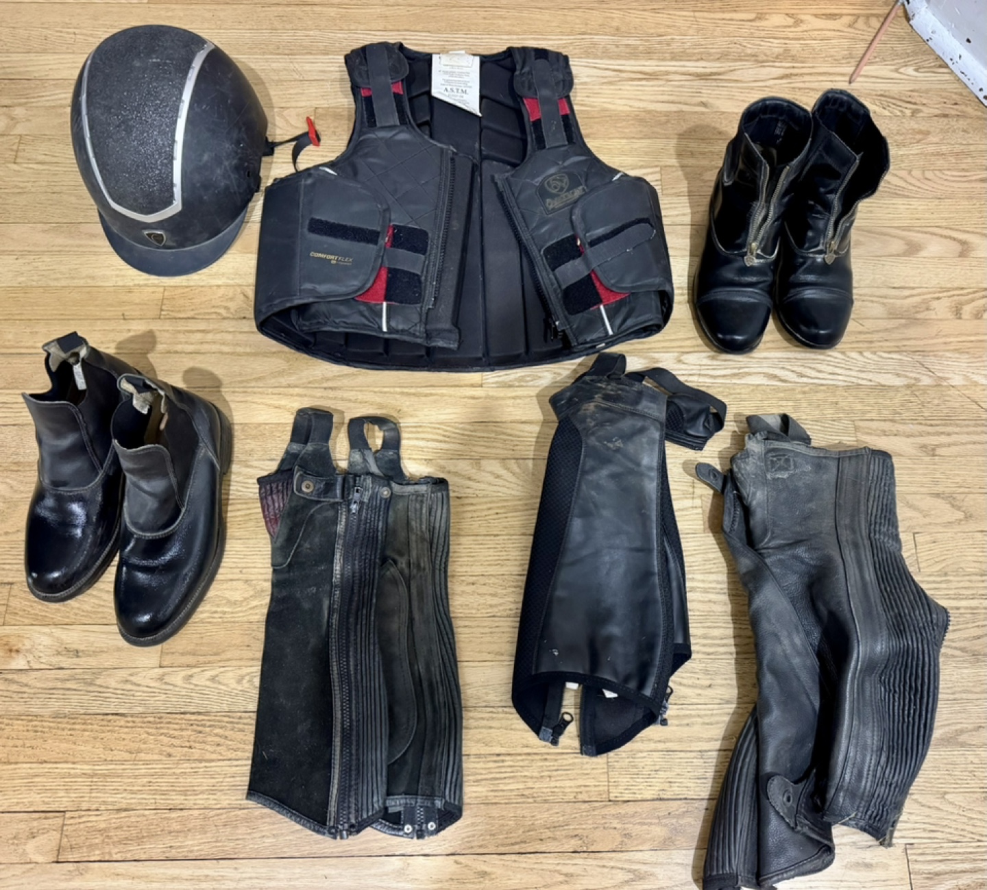 Selling a set of equestrian gear, including a helmet (size 56/56) protective vest (kids small age 8-12), boots (size 7 and 8), and chaps. All items are in used condition with signs of wear. Please see photos for details