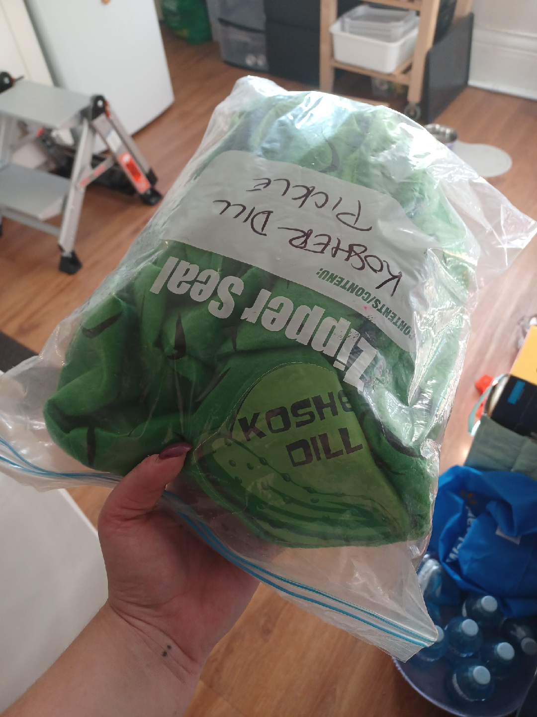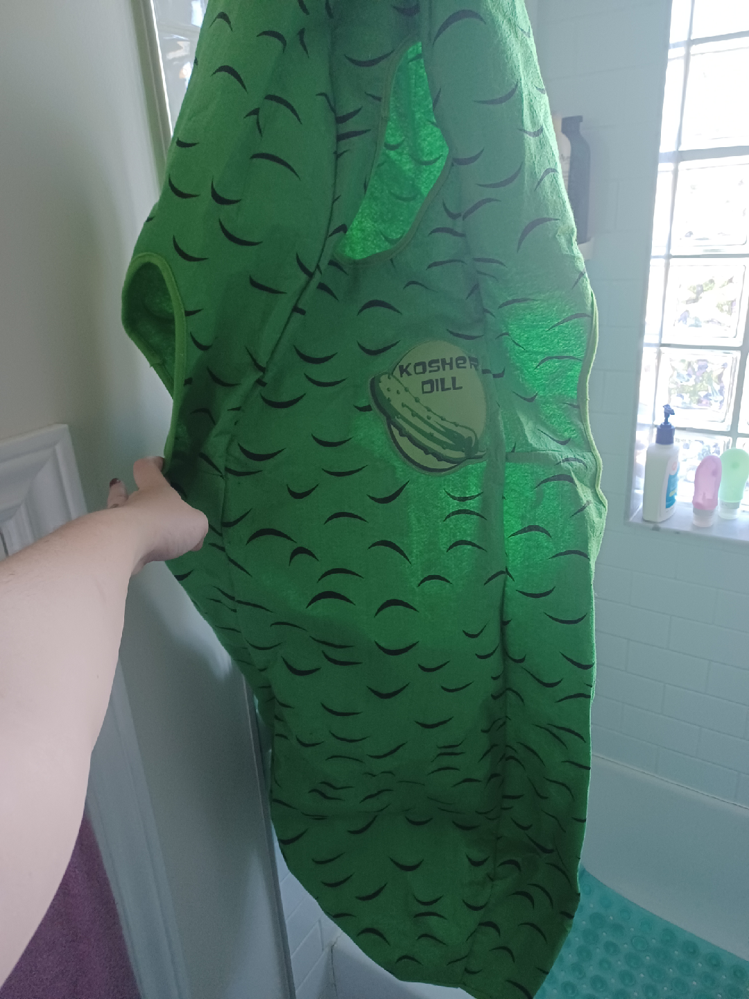 OS felt type material Kosher dill pickle costume; folds down easily so good for your last minute needs. Worn to host the Rocky Horror Picture Show three Halloweens in a row so used but lots of life left.