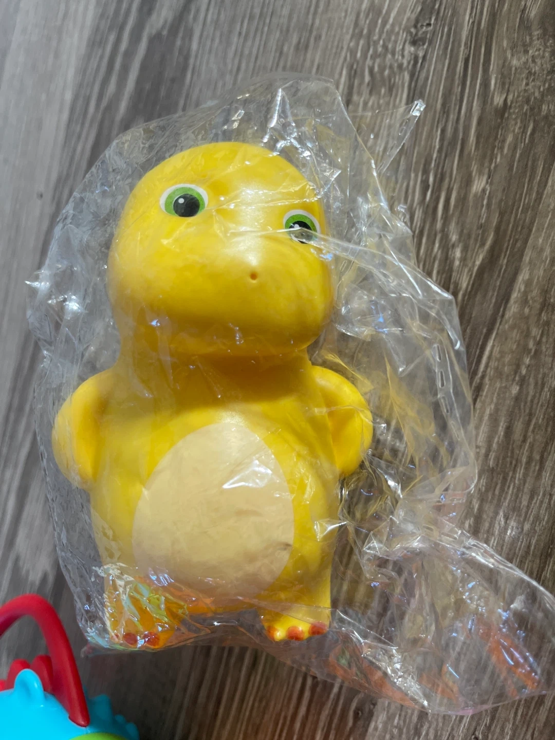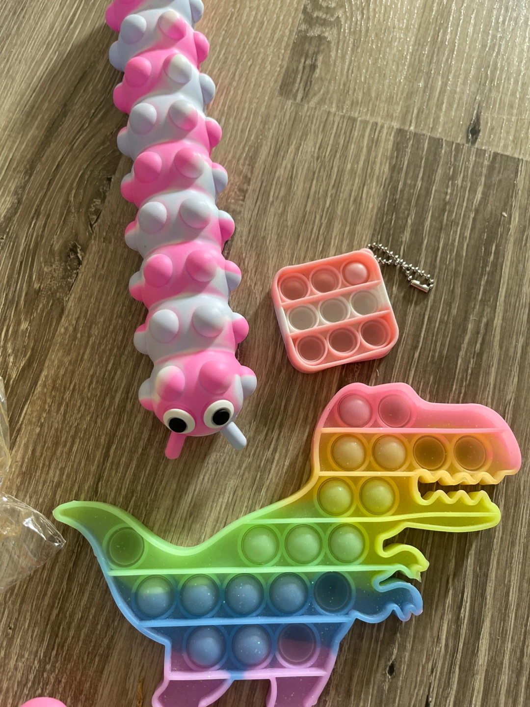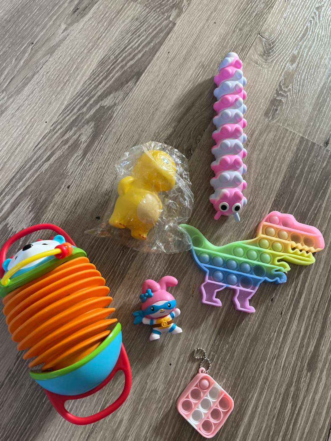 A selection of kids' toys! Includes a Dinosaur Train Buddy figure still in its original packaging, a caterpillar fidget toy, a dinosaur fidget toy, an accordion toy, and a small square fidget toy