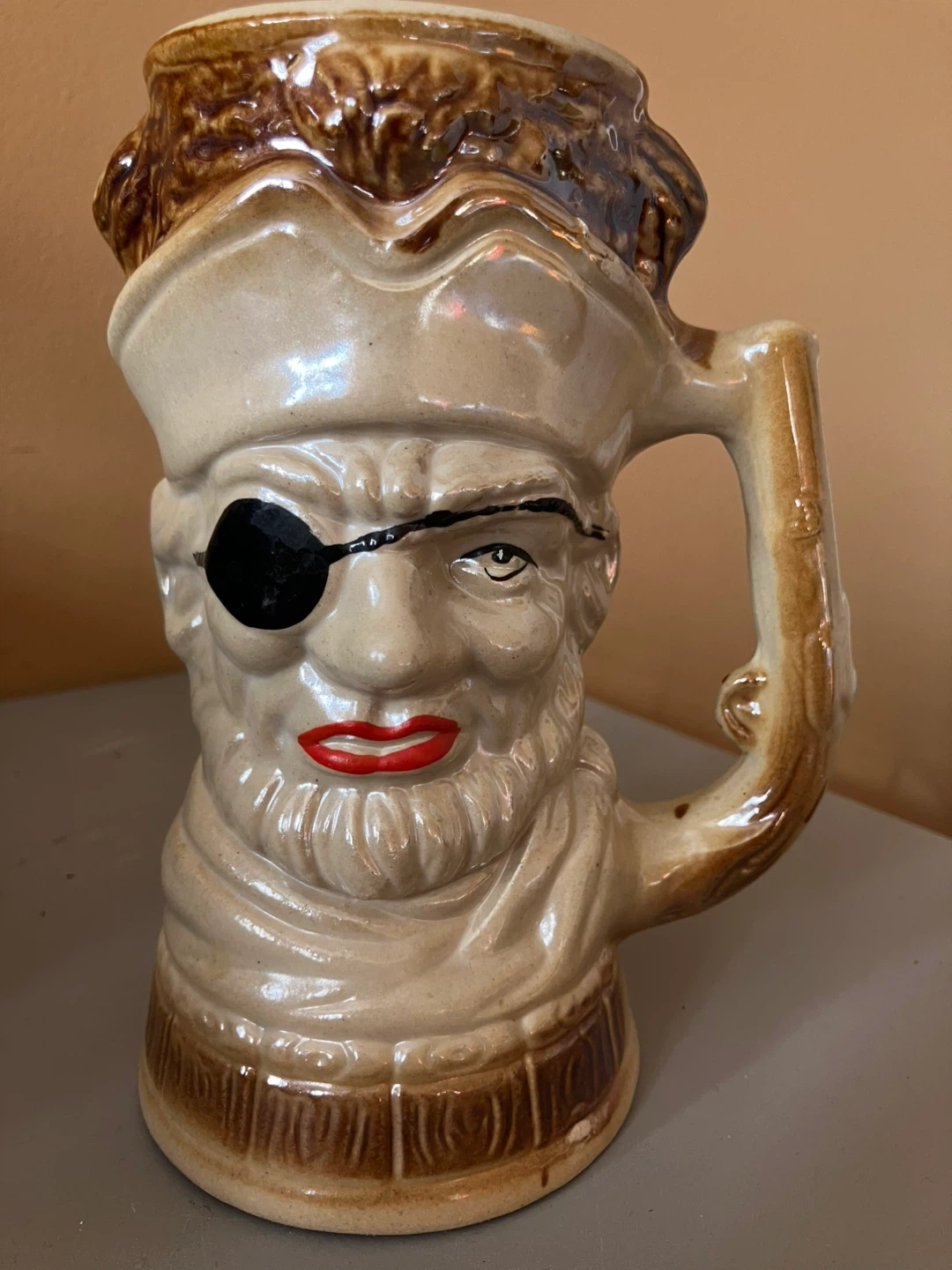 Selling a unique vintage pirate mug! It's got a fun, quirky design with a pirate face, complete with an eye patch and red lips. Perfect for adding some character to your kitchen or collection