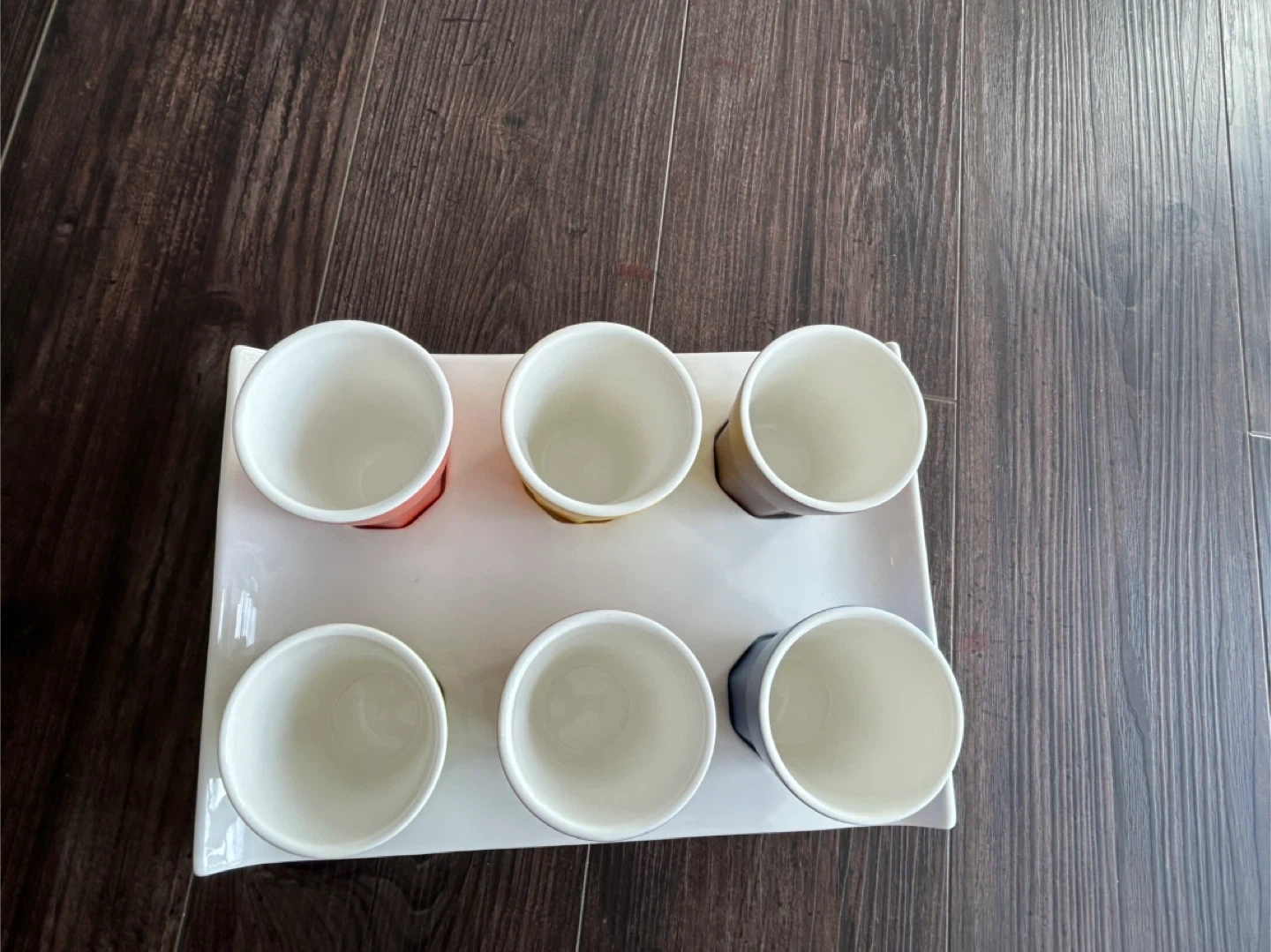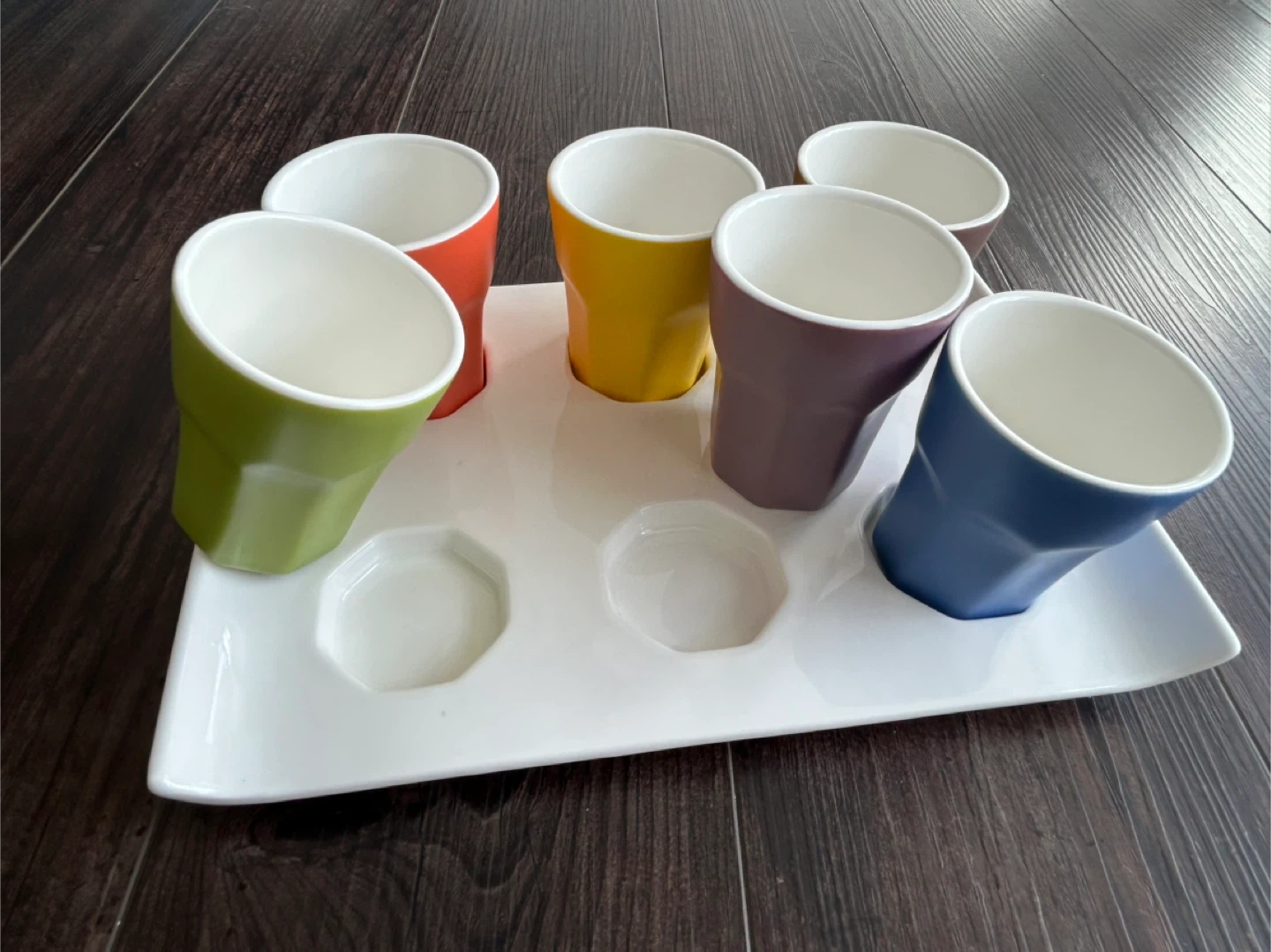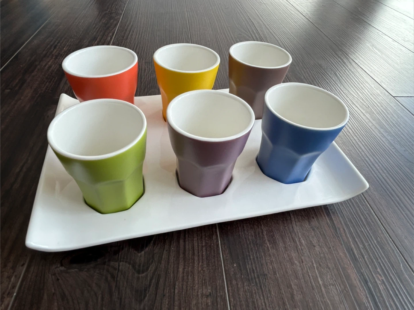 Here's a fun and vibrant set of six espresso cups, each in a different colour, complete with a white serving tray! Perfect for adding a pop of colour to your morning coffee routine or for serving guests. They're in great condition and ready for a new home
