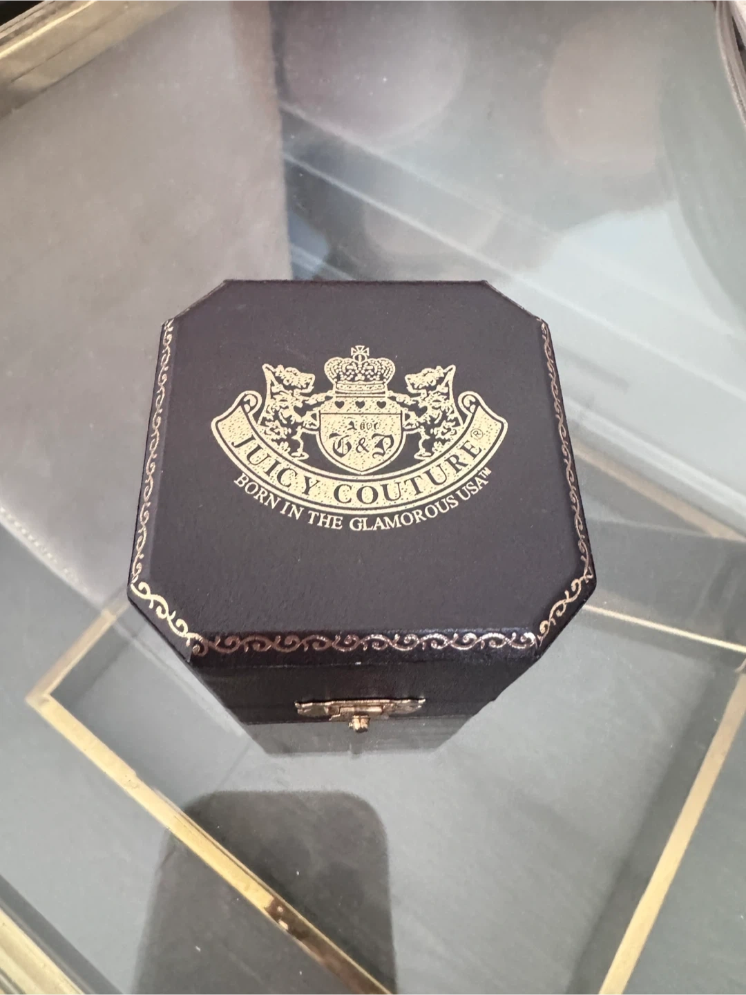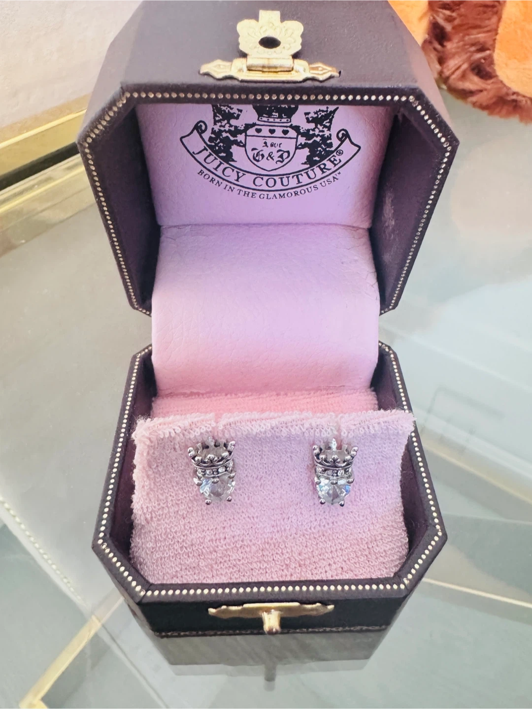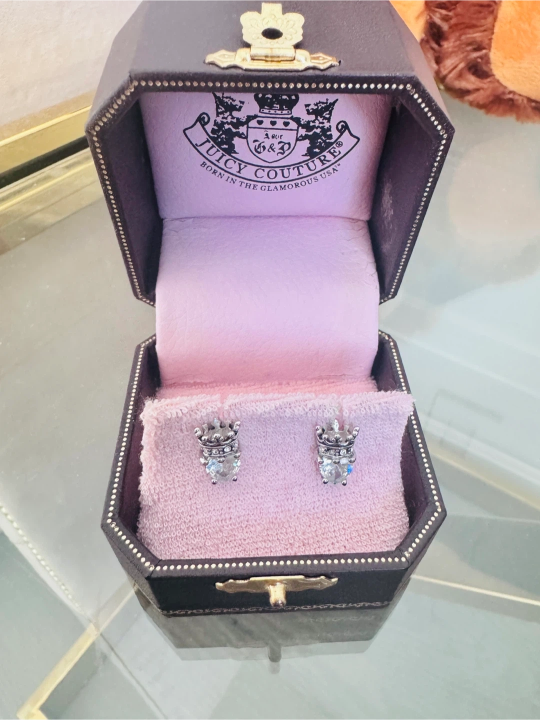 These adorable Juicy Couture crown stud earrings are in excellent condition and come with their original box! They're perfect for adding a touch of glamour to any outfit. The earrings feature a cute crown design with a sparkling stone in the center. A great addition to your jewelry collection!