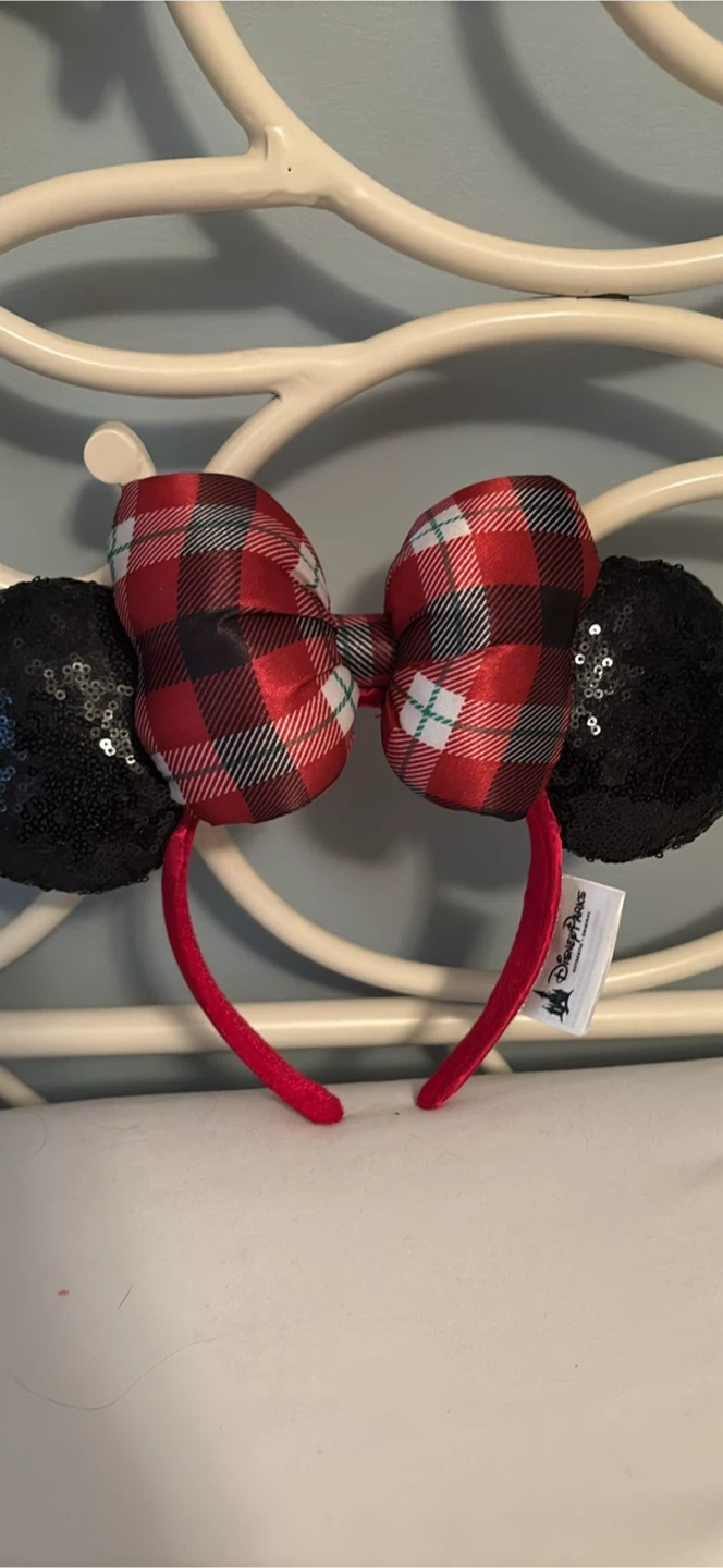 Here's a cute Minnie Mouse ears headband from Disney Parks! The bow has a festive red plaid pattern, and the ears are covered in black sequins. Perfect for your next trip to Disney!