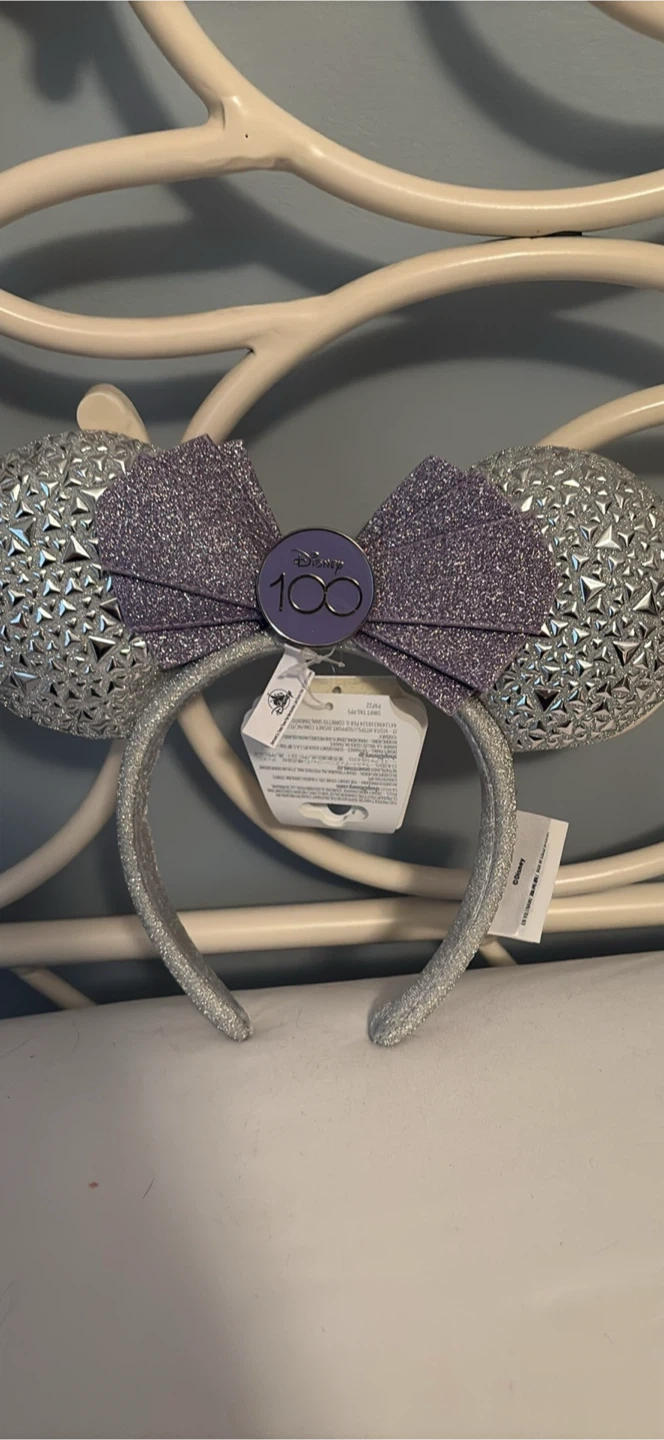 Selling a pair of Disney 100th Anniversary Minnie Mouse ears. These ears are silver and lavender with a glittery finish, perfect for any Disney fan or collector!